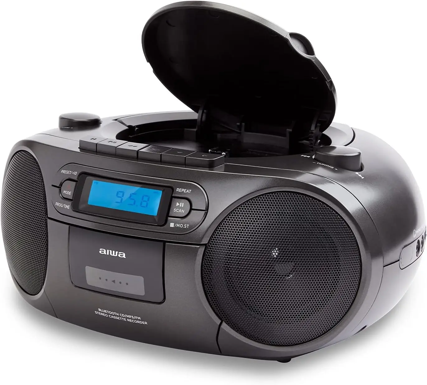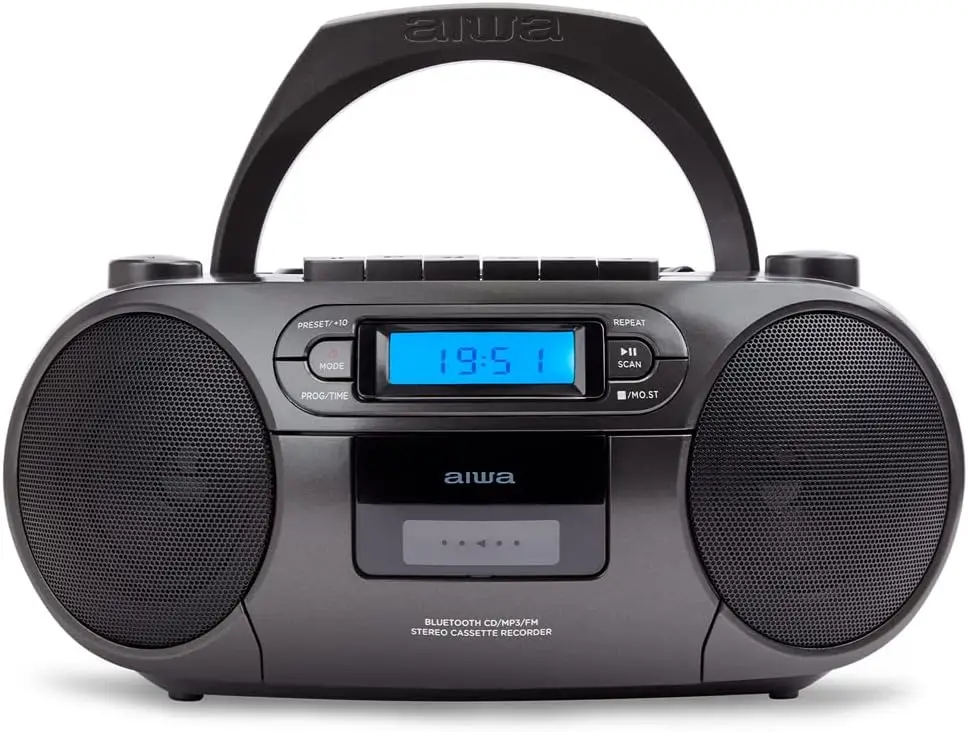Aiwa BBTC-550BK – must kaasaskantav raadio, mis ühendab CD-mängija, Bluetooth-voogedastuse, USB-ühenduse ja kassettide salvestamise funktsioonid, pakkudes mitmekülgset heli kuulamiseks ja salvestamiseks.