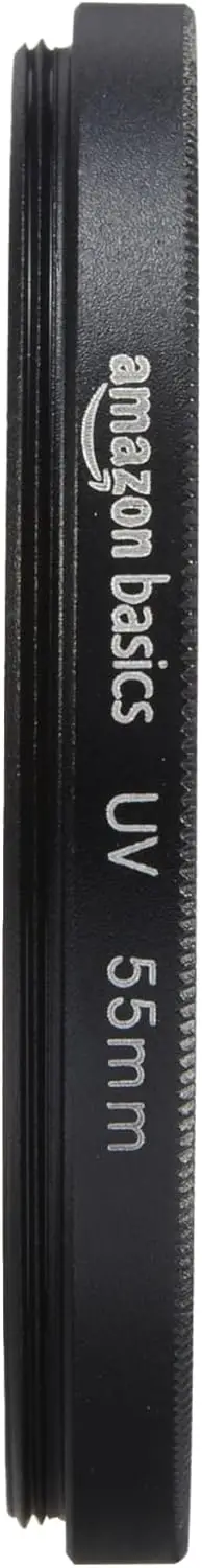Amazon Basics 55mm UV Protection Filter – a round lens filter that reduces ultraviolet light for clearer images while protecting the lens from dust, dirt, and scratches.