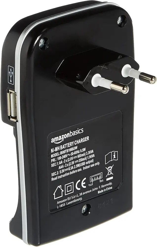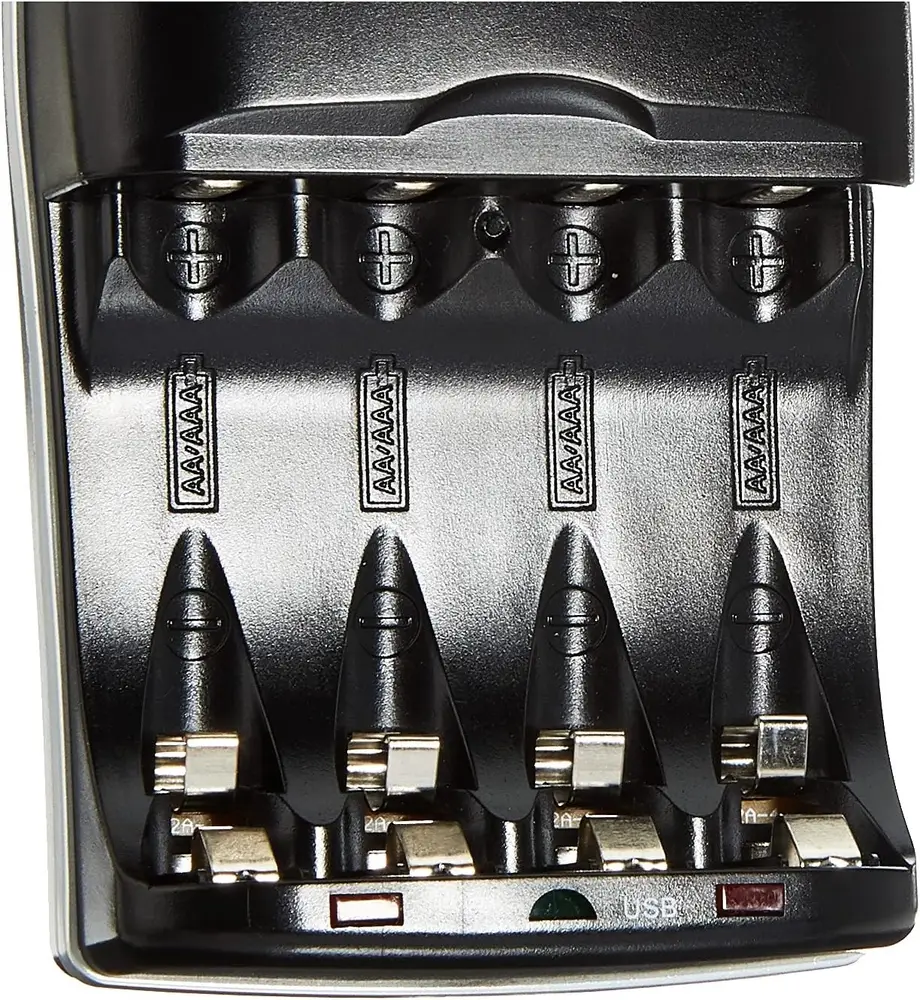 Laadimisaeg: 4 tundi, Ühilduvus: AA ja AAA NiMH akud, USB-port: 500 mA väljund, Toide: 100–240V AC, Kaitse: polaarsuse kaitse ja ülelaadimise katkestusfunktsioon, Kasutus: reisisõbralik kokkuklapitav pistik, Värv: Must, Mõõtmed: 11.4 x 7 x 3.8 cm, Kaal: 104 g