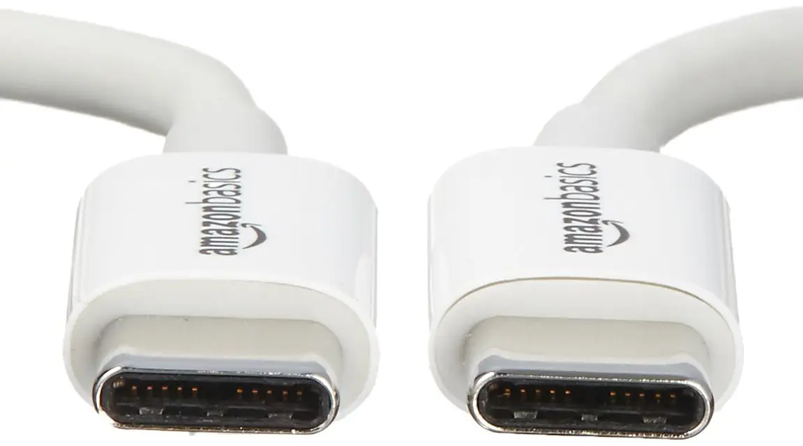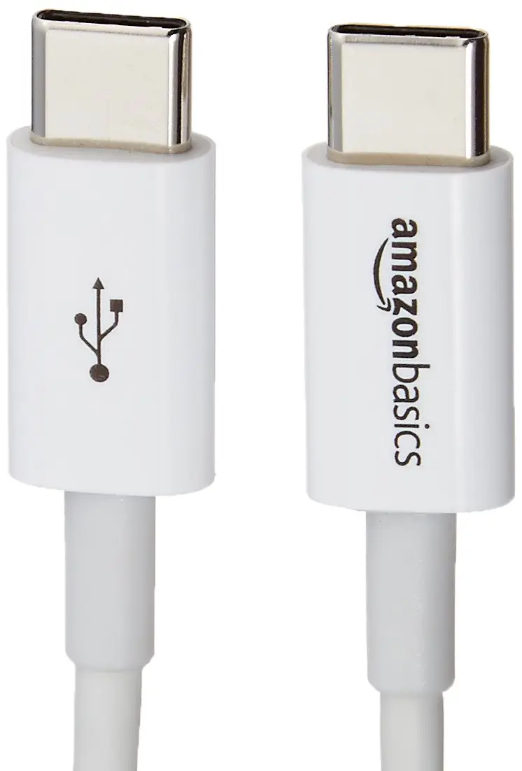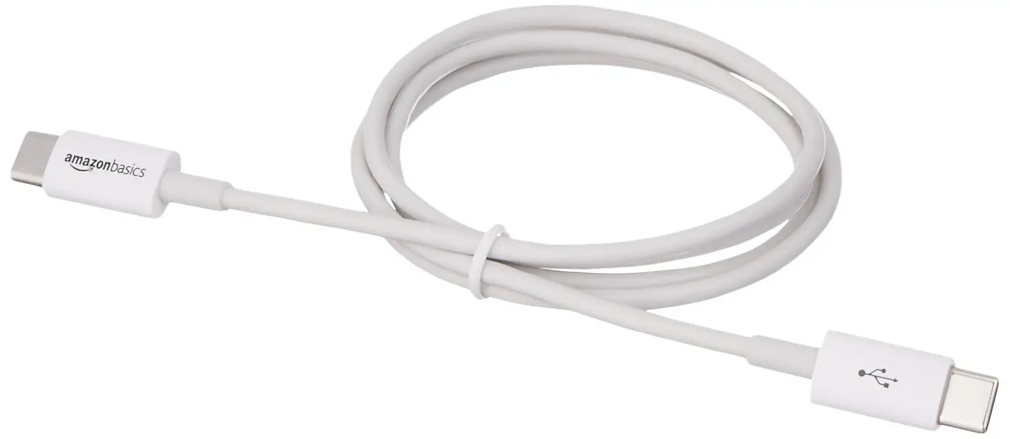 Amazon Basics USB-C to USB-C Fast Charging Cable – a 1.8m white cable featuring 480 Mbps data speeds and USB-IF certification for fast charging Apple iPhone 16/15, MacBooks, and other USB-C devices.