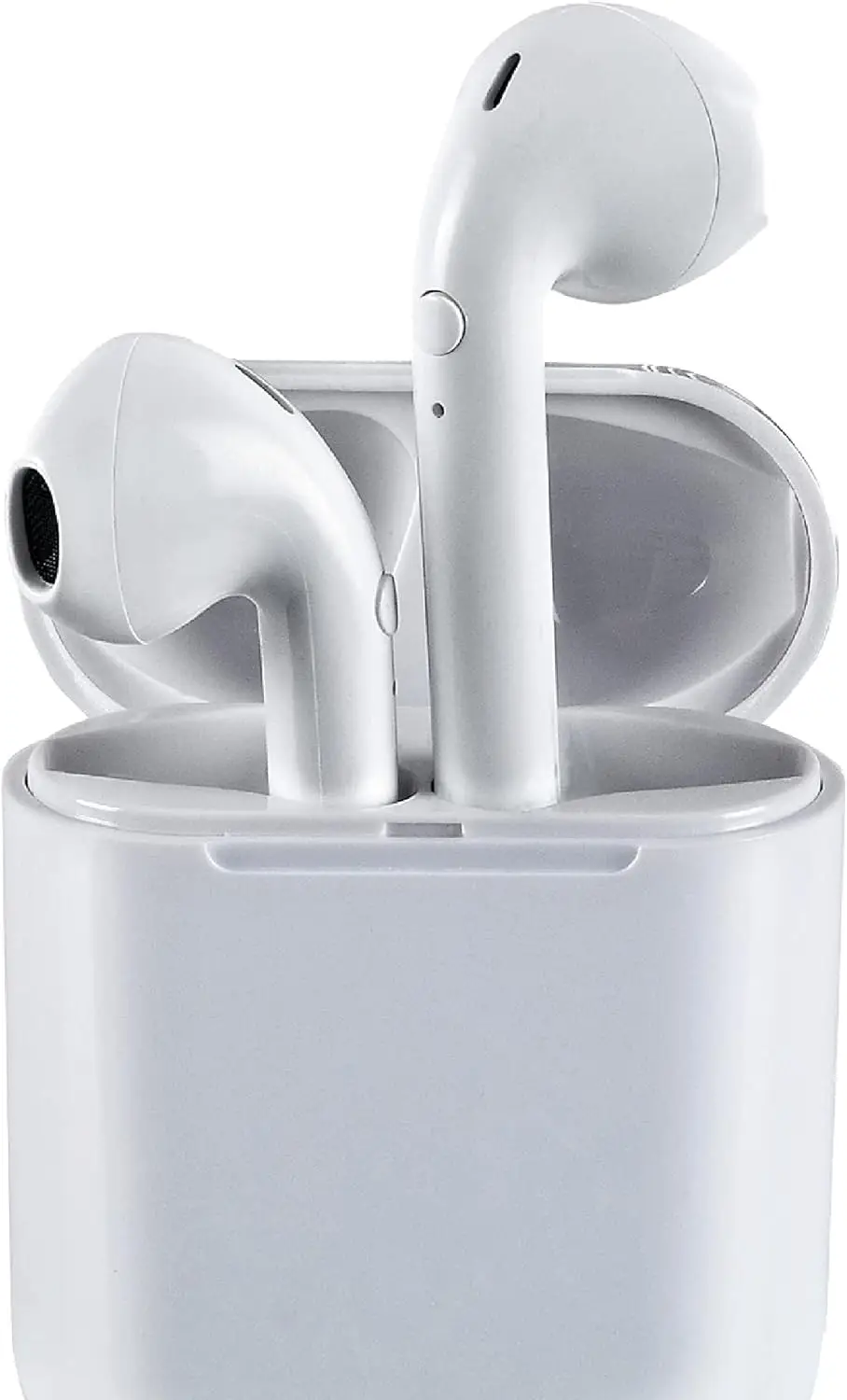 APM 200026 Wireless Bluetooth Headphones (White) – stereo earbuds featuring a dedicated charging box and physical control buttons, compatible with PCs, smartphones, and tablets.