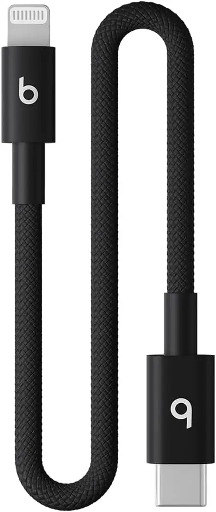 Beats USB-C to Lightning lühike punutud kaabel (20 cm) – vastupidav ja sassiminekukindel must kiirlaadimiskaabel, mis on mõeldud Apple’i Lightning-pordiga seadmete ühendamiseks ja laadimiseks.