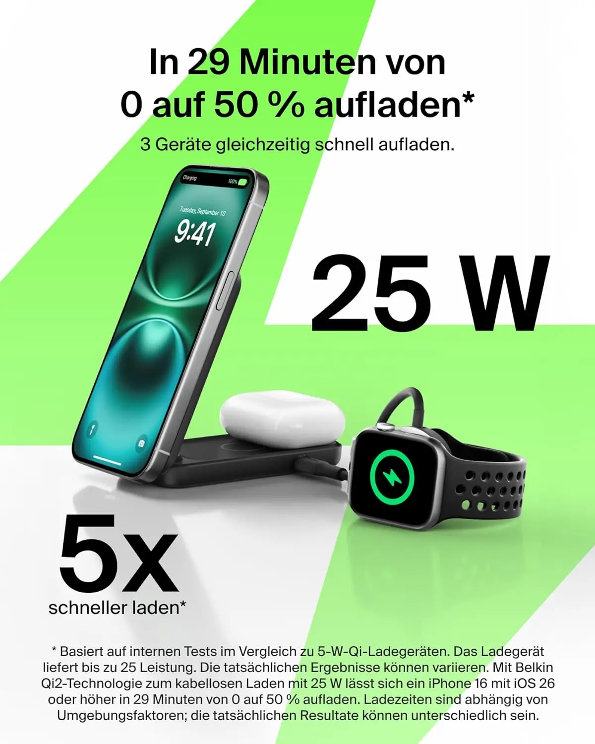 Belkin UltraCharge Qi 2.2 2-in-1 Charging Station – a black 25W MagSafe-compatible wireless charger for iPhone 17, iPhone Air, and AirPods, featuring a 45W USB-C power adapter.