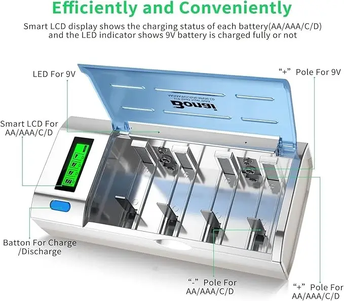 BONAI kiire universaalne patareide laadija sobib AA, AAA, SC, C, D ja 9V NI-MH/NI-CD akudele. Tõhus ja mitmekülgne lahendus erinevate akude kiireks laadimiseks kodus või kontoris.