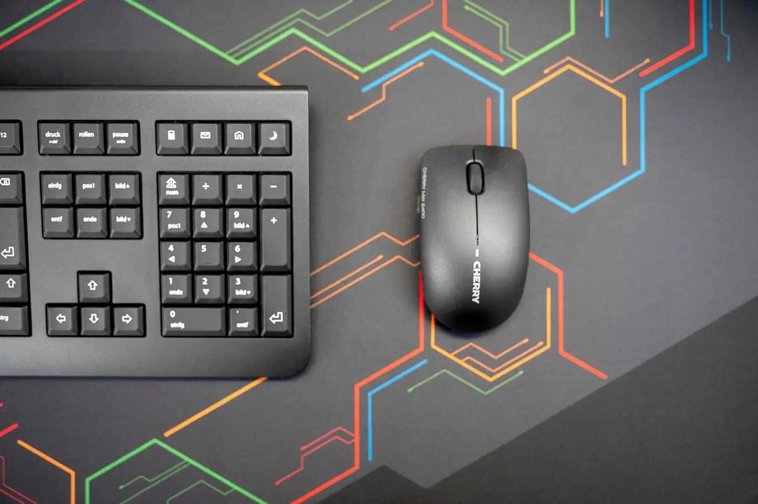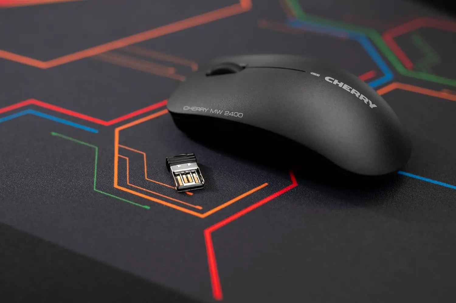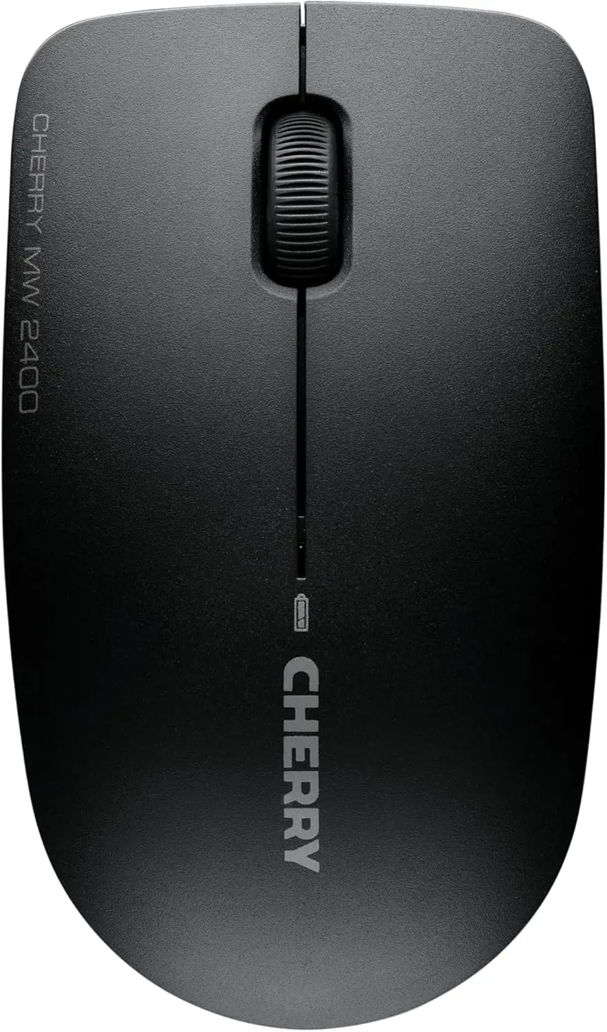 CHERRY MW 2400 – sümmeetrilise disainiga must juhtmevaba hiir, mis sobib nii parema- kui ka vasakukäelistele, kasutades stabiilset 2,4 GHz raadioühendust, täpset optilist sensorit ja omades GS-sertifikaati.