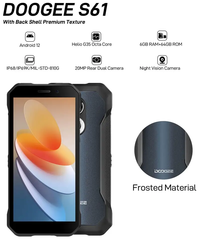 DOOGEE S61 – vastupidav nutitelefon 6 GB RAM-i ja 64 GB salvestusruumiga, matt viimistlus, veekindel ja tolmukindel korpus. Ideaalne aktiivseks kasutuseks. Raamil ja korpusel väiksed kulumisjäljed.