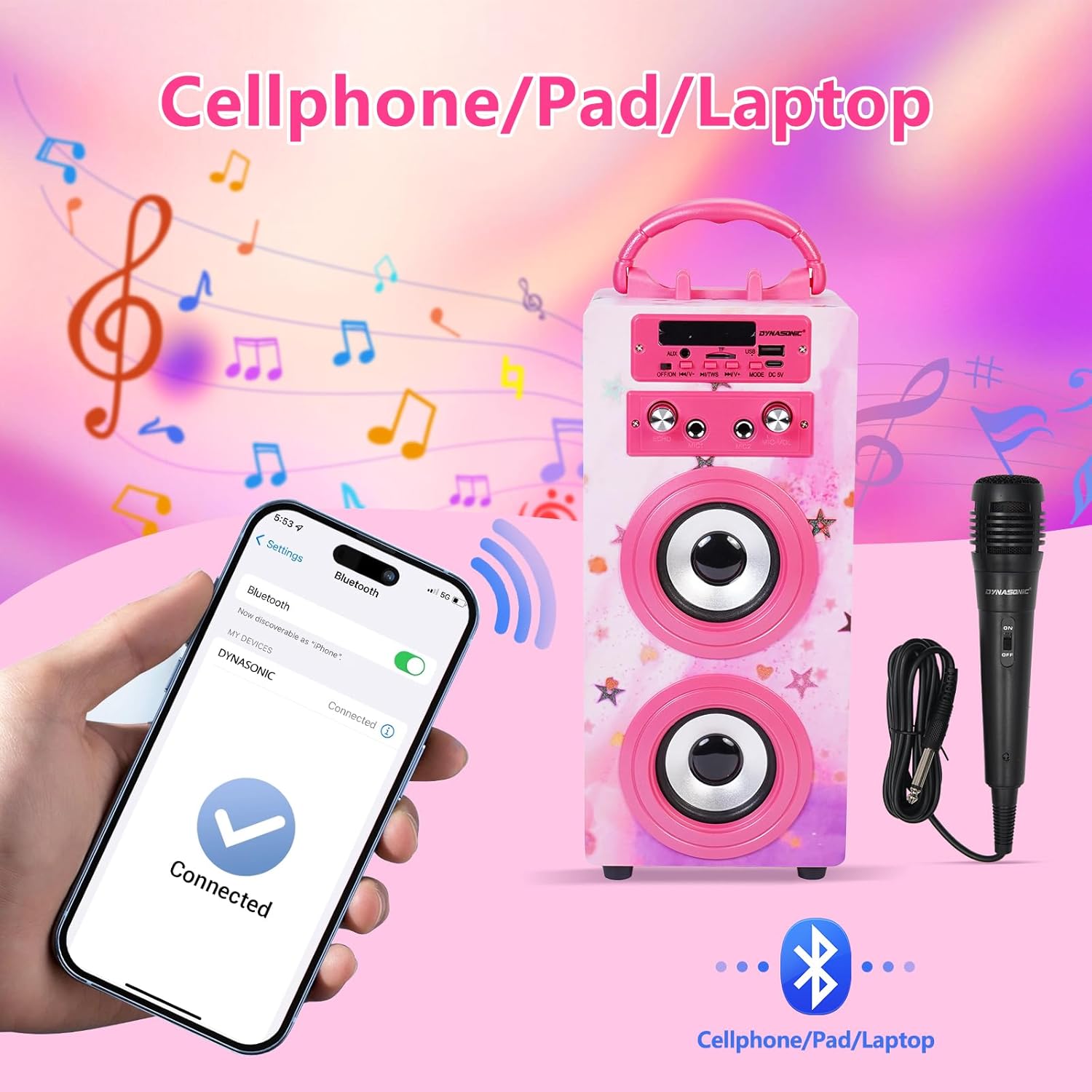 DYNASONIC Karaoke Machine with 2 Microphones, Portable Bluetooth Speaker with Lights, USB and SD Reader, Gift for Children Ages 5-13 (Model 15 lights)