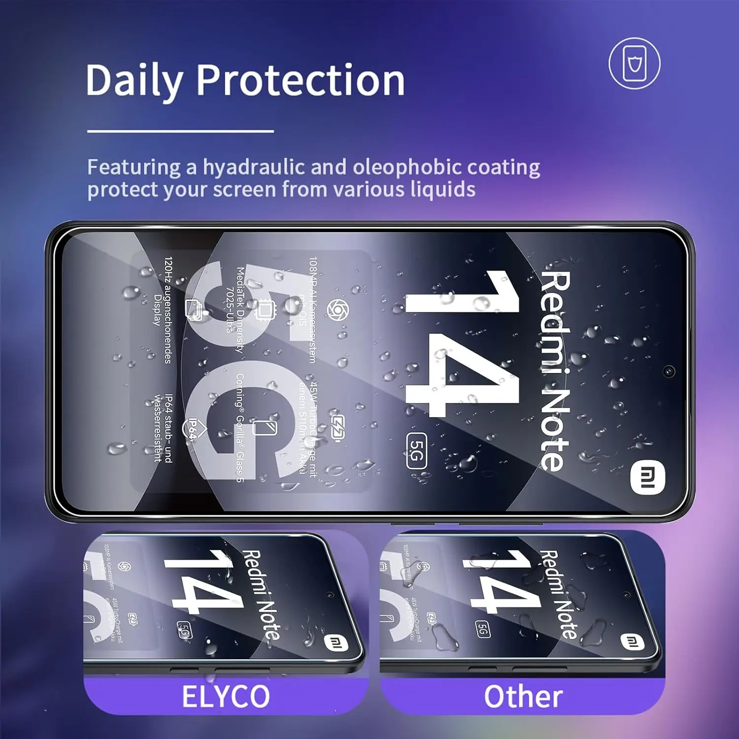 ELYCO pack for the Xiaomi Redmi Note 14 5G features three 9H hardness tempered glass screen protectors and two camera lens protectors, designed for bubble-free application and HD clarity with anti-scratch protection.