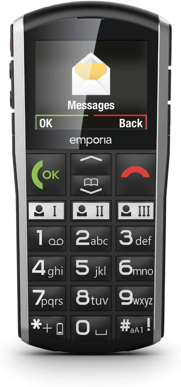 emporiaSIMPLICITY Senior Mobile Phone – a black feature phone with a 2-inch display, large tactile buttons, an emergency SOS button, and an included charging cradle.