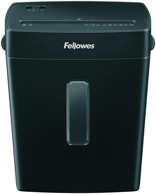 Fellowes FS-8C paberipurustaja – must seade, mis purustab kuni 8 lehte korraga ristlõikena ning suudab hävitada ka kirjaklambrid ja krediitkaardid, 15 L prügikastiga — ideaalne individuaalseks- ja kontoritööks.