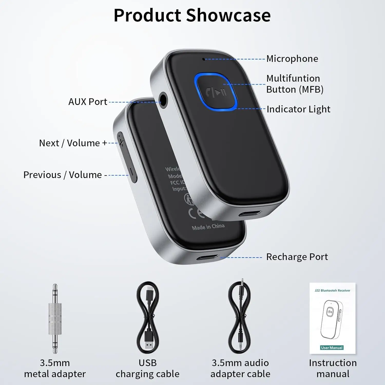 Bluetooth 5.0 receiver with a 3.5mm AUX interface provides 16 hours of wireless music playback and hands-free calling for car stereos or headphones.