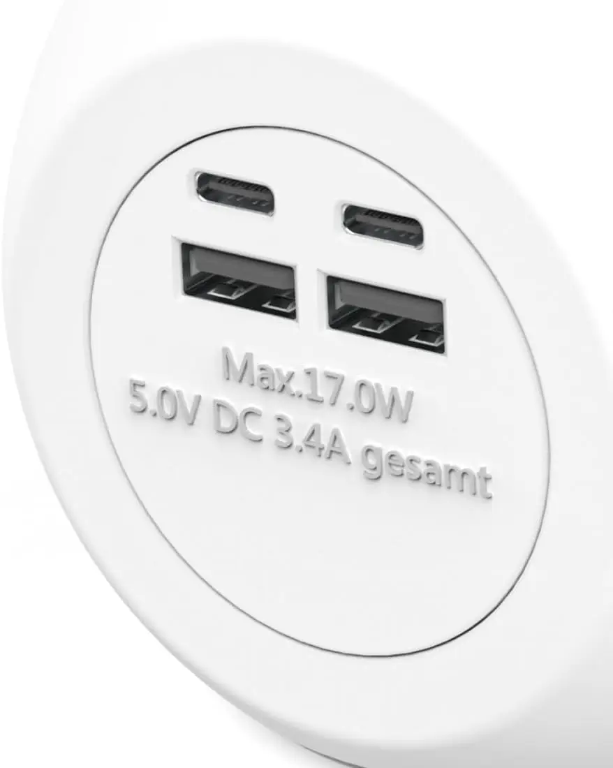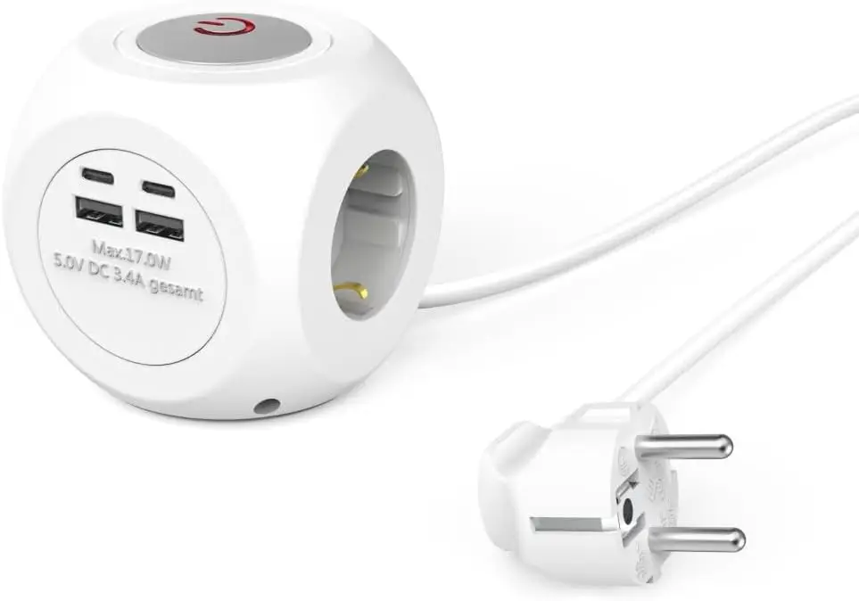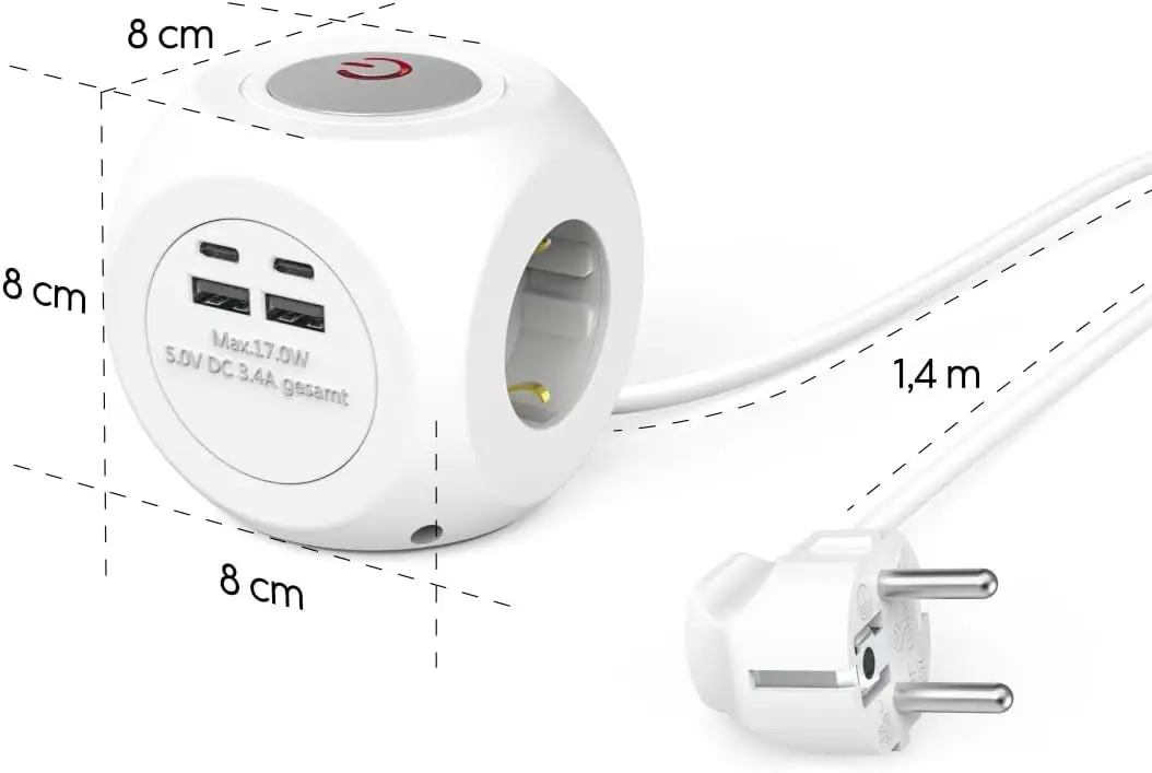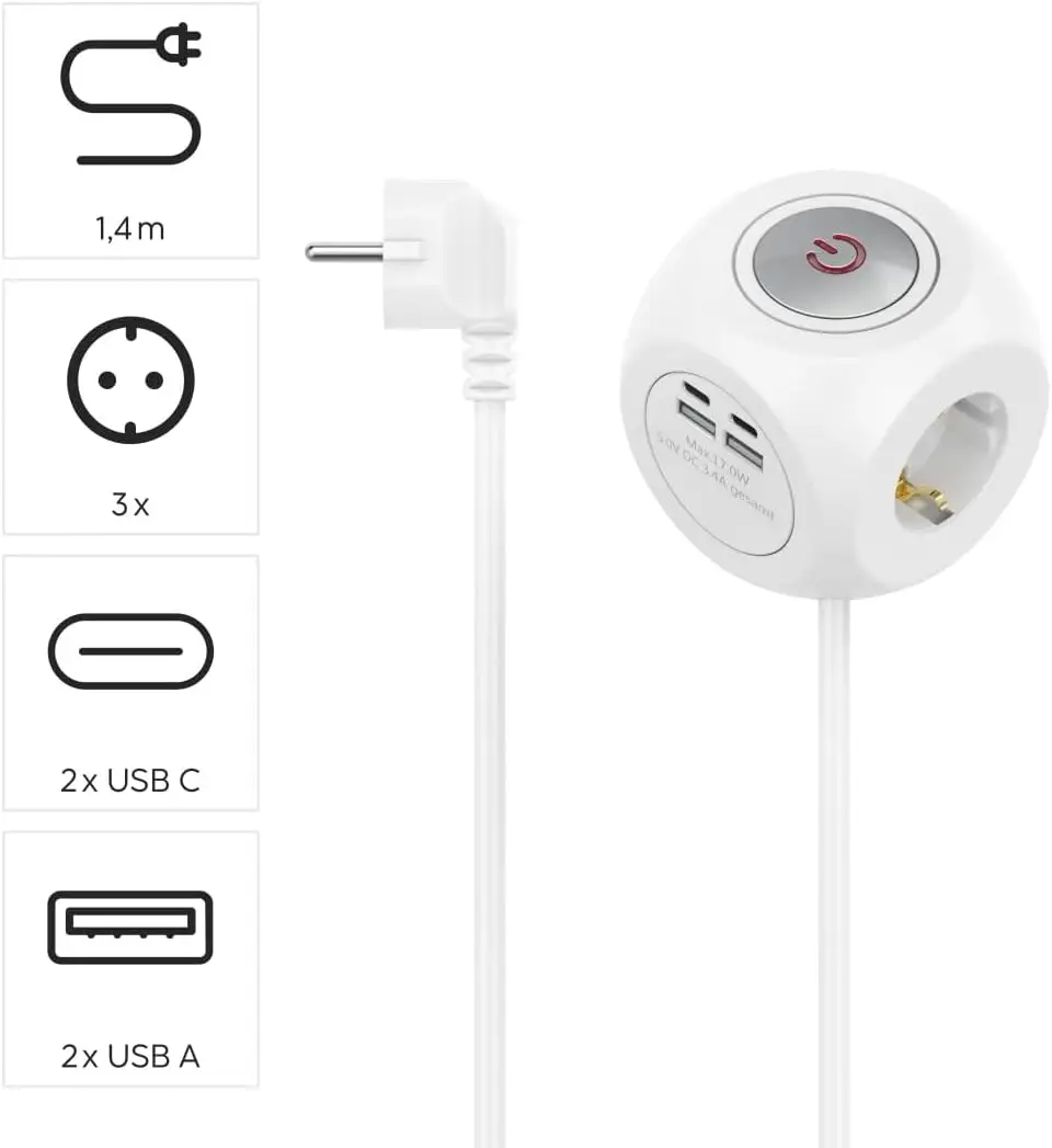 Pikendusjuhe/vargapesa 3 väljundiga, on/off lülitiga, pikkus 1.4 meetrit. 2x usb-c ja 2x usb-a väljundit.