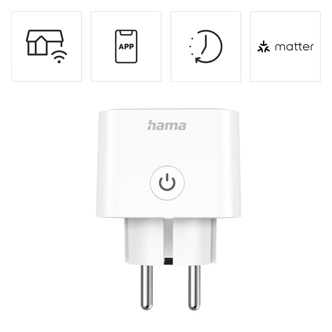 Hama WLAN Matter Smart Socket – a universal 3680W smart plug featuring power consumption monitoring and timer functions, compatible with all major smart home platforms via the Matter standard.