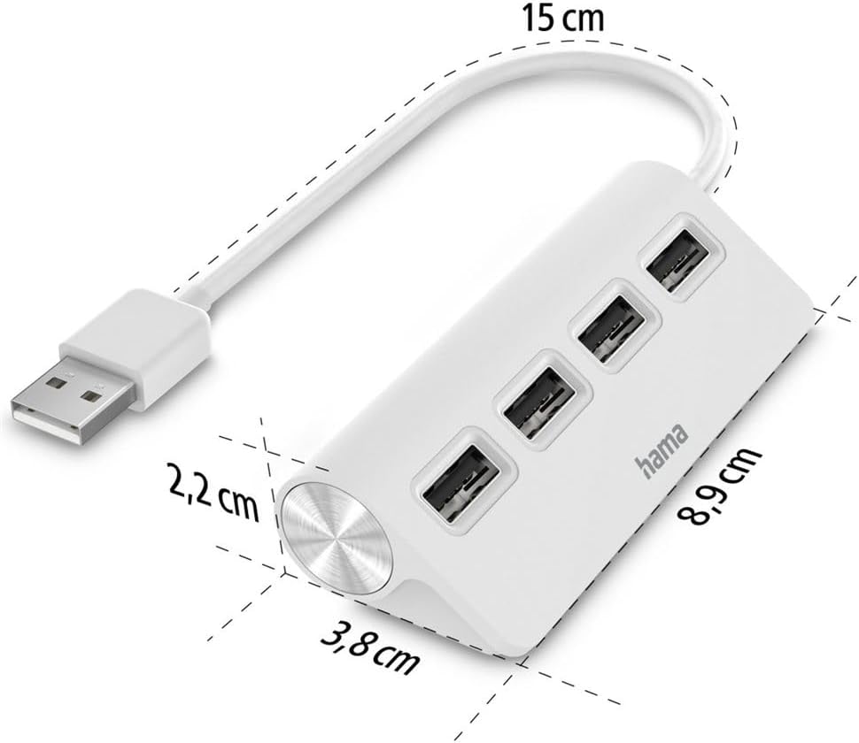 Hama USB hub – white 4-port USB 2.0 hub with up to 480 Mbps transfer speed and metal housing, expanding a single USB port into multiple connections for laptops or desktops.