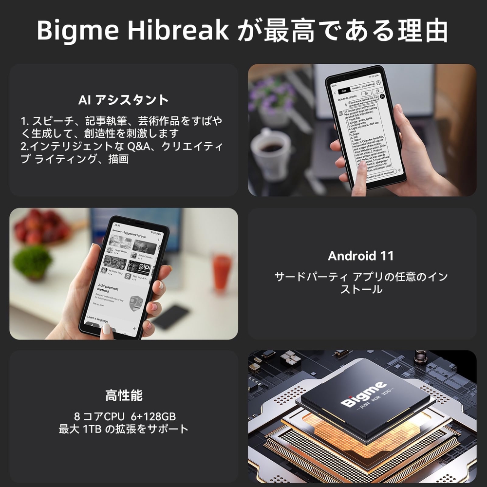 Avasta Bigme Hibreak, uuenduslik e-ink nutitelefon, mis võib tehnoloogia piire nihutada. Tema edasijõudnud GPS-navigeerimissüsteem tagab, et sa ei jää kunagi orienteerimise puudujääki. Automaatne varjukate eemaldamine tagab selge ja terava ekraani, samas kui patenteeritud xColor värviparanduse algoritm elustab sinu pilte. Koge tehnikat nagu kunagi varem Bigme Hibreak’iga, kus iga funktsioon on sammu tulevikku.
