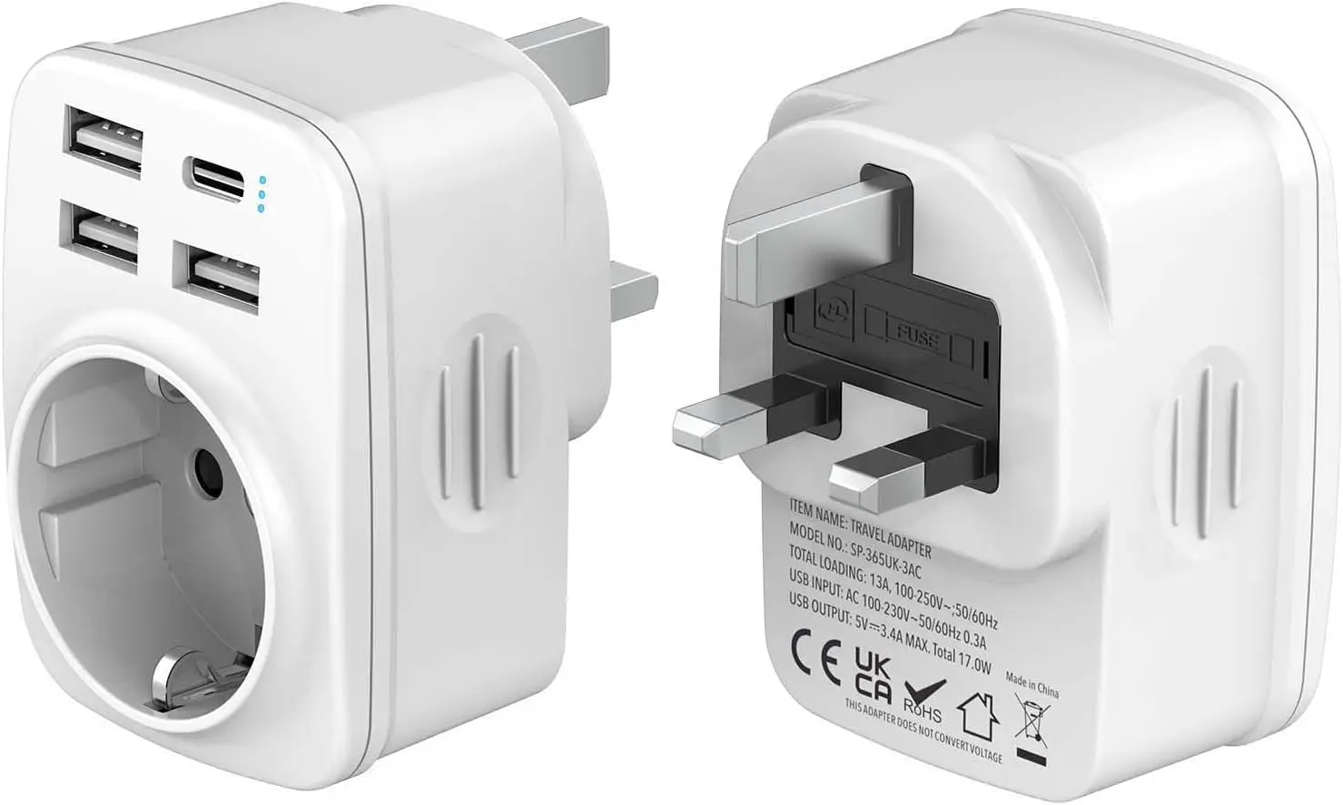 5-ühes Inglismaa pistikupesa adapter, Ühendkuningriigi adapter 3 USB A ja 1 USB C-ga, G-tüüpi reisiadapter Inglismaa, Iirimaa, Dubai ja Maldiivide jaoks