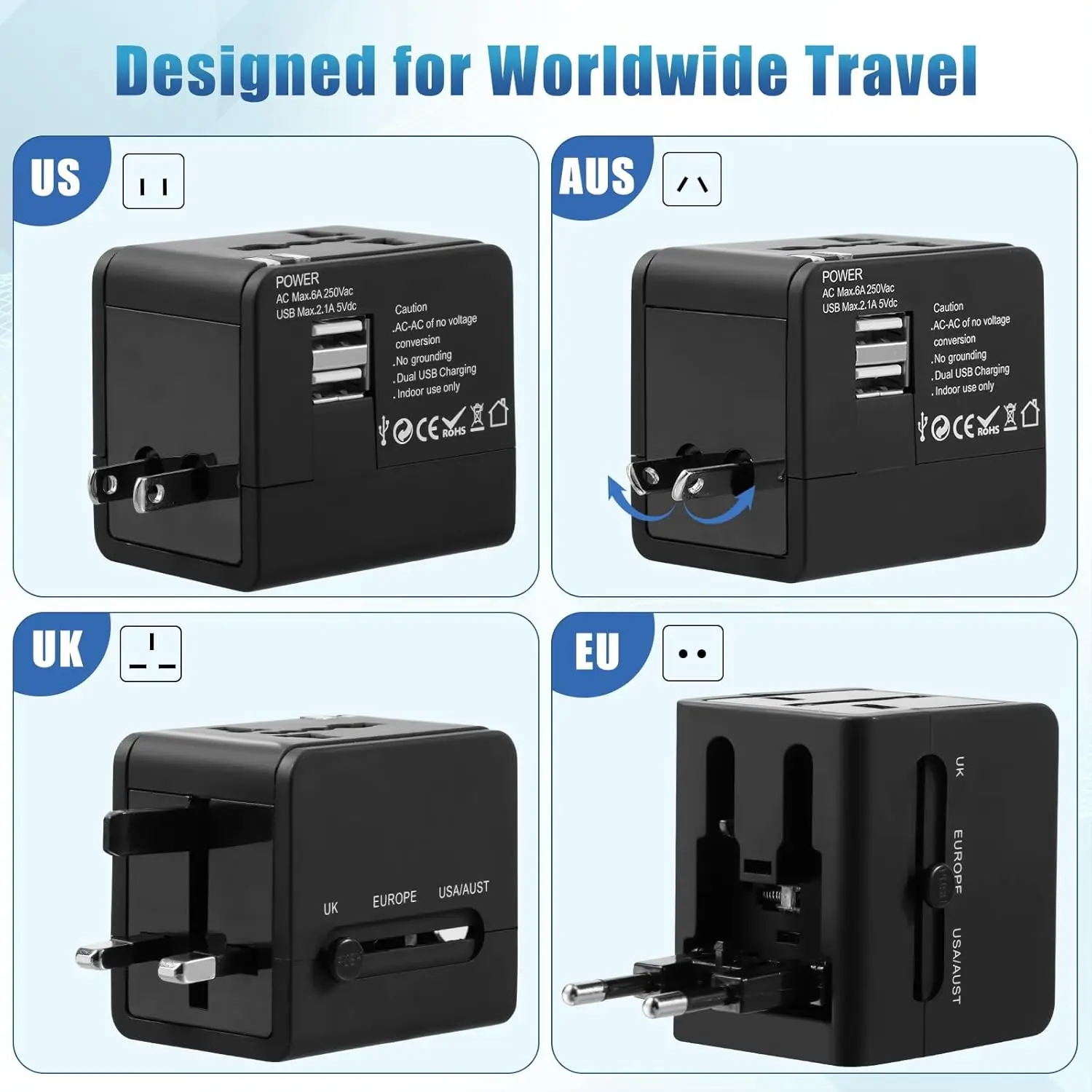 Hoppac universaalne pistikupesaadapter – 4-in-1 reisipistik koos kahe 2,1 A USB-pordiga ja kuni 1500 W võimsusega, sobib kasutamiseks USA, UK, EU, AUS ja enam kui 150 riigi elektrisüsteemidega.