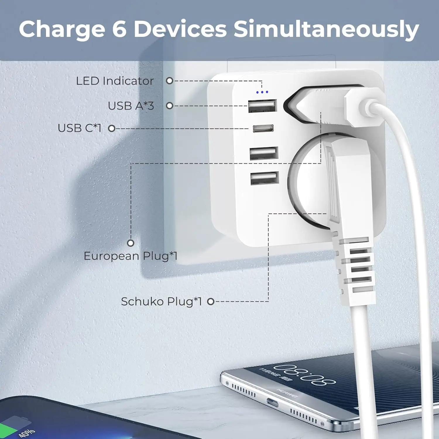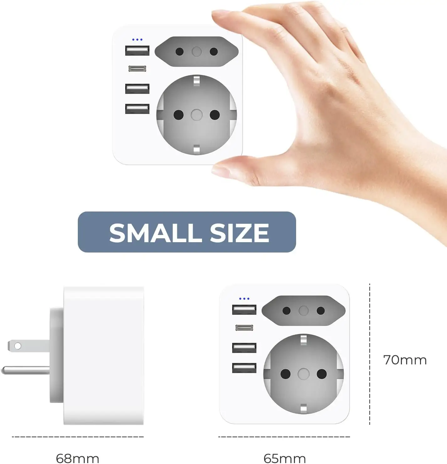 Hoppac USA adapterpesa, 6-ühes adapter USA ja Saksamaa pistikuga, reisiadapter USA-sse 3 USB ja 1 USB C-ga (3,4 A 17 W), multifunktsionaalne adapter USA-sse, Kanadasse, Mehhikosse, tüüp B