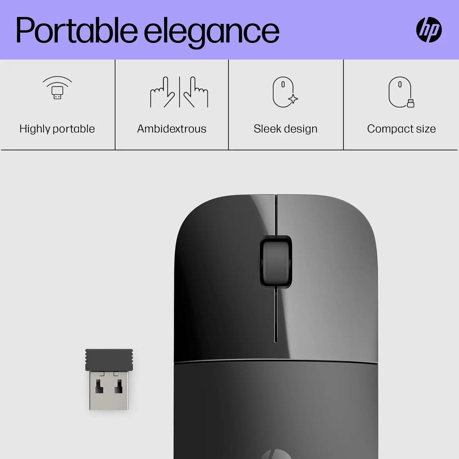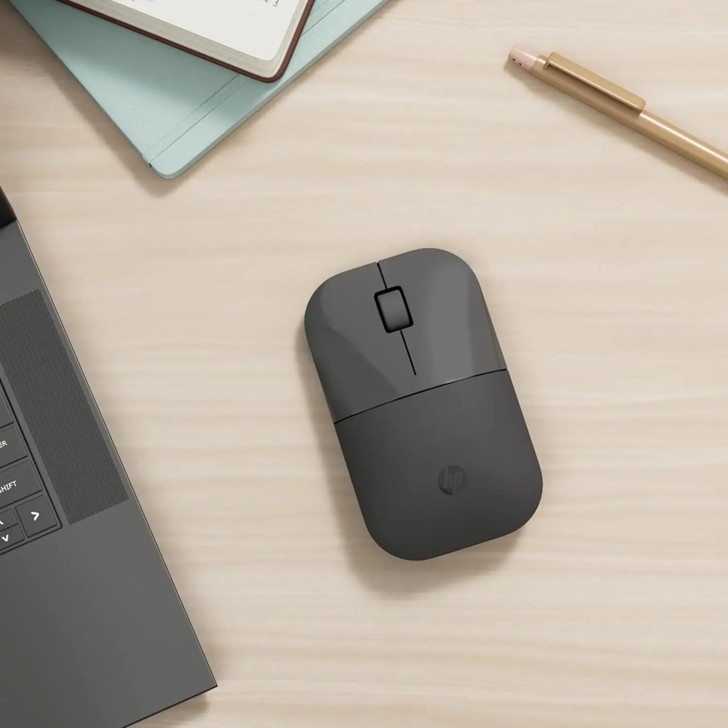 HP Z3700 Wireless Mouse – a sleek, low-profile black mouse featuring a 1200 DPI optical sensor, up to 16 months of battery life, and reliable 2.4 GHz or Bluetooth connectivity for versatile use.