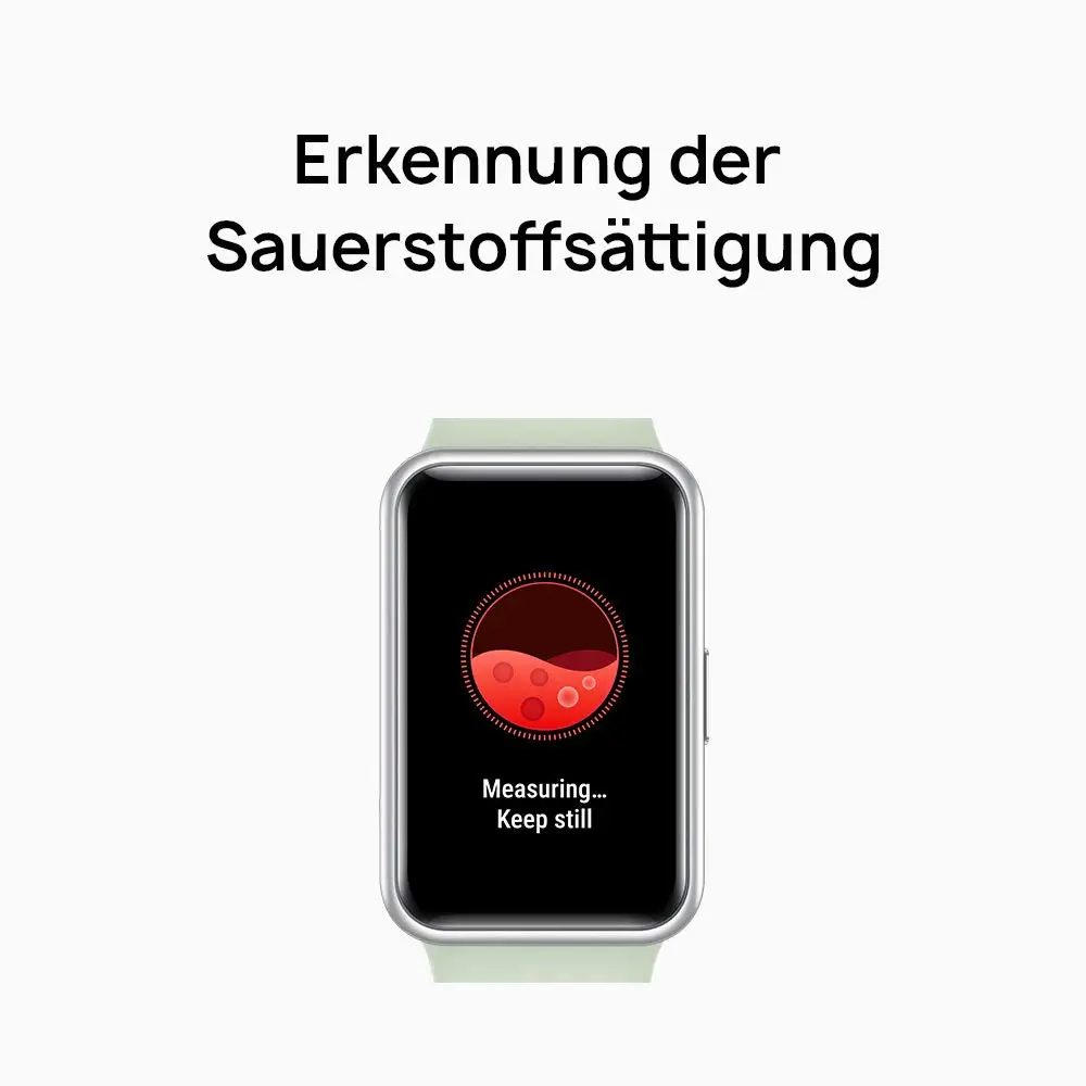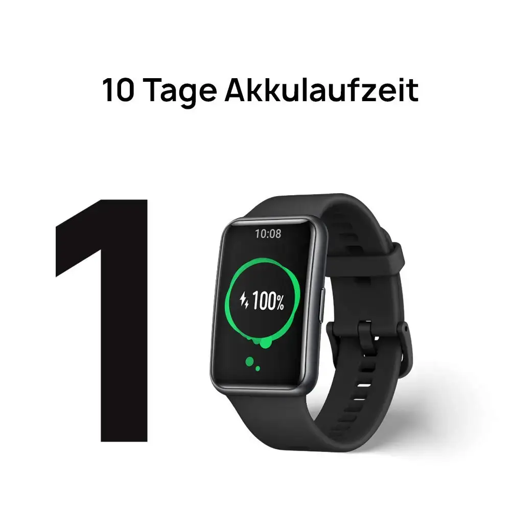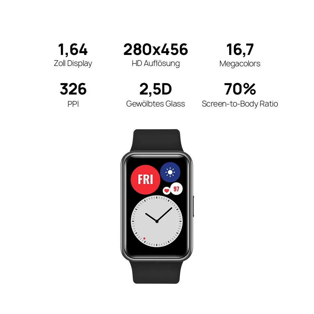 Huawei Watch Fit — mõõtmed 46 × 30 × 10,7 mm; 1,64‑tolline AMOLED‑ekraan 456 × 280 px; kaal ~ 21 g (ilma rihmata); 180 mAh aku, kuni 10 päeva tööaega; veekindlus 5 ATM; andurid: 6‑telg IMU (kiirendus + güroskoop), optiline pulsimõõtja; ühenduvus: Bluetooth 5.0; ühilduvus: Android ≥ 6.0 ja iOS ≥ 9.0