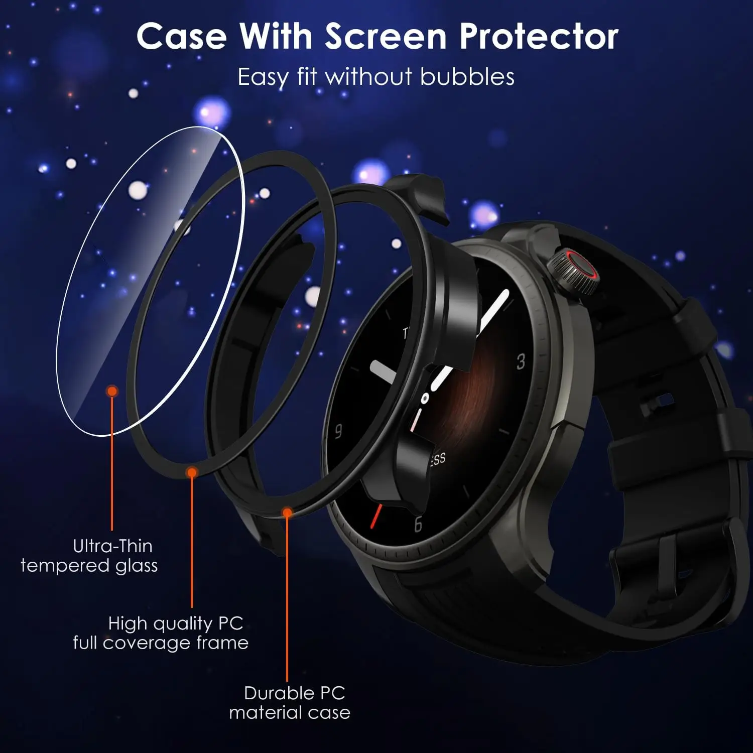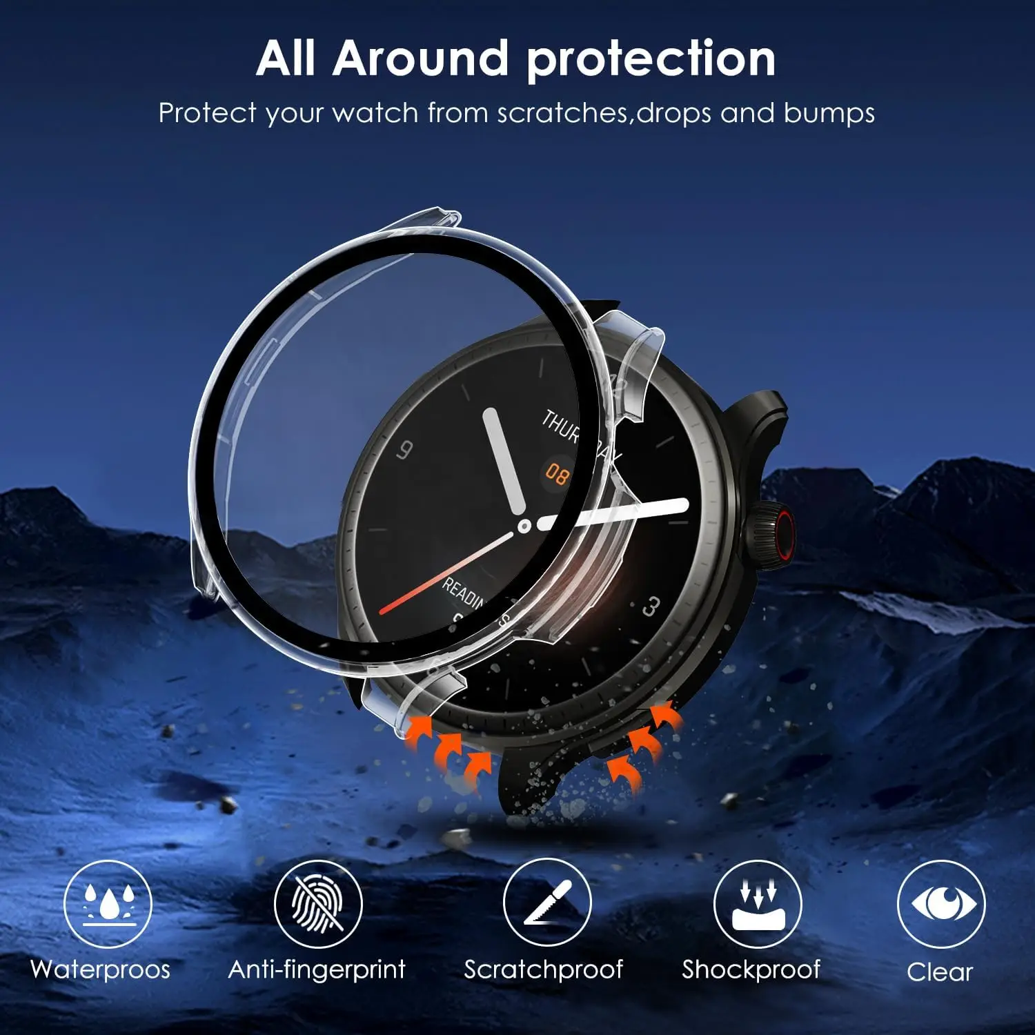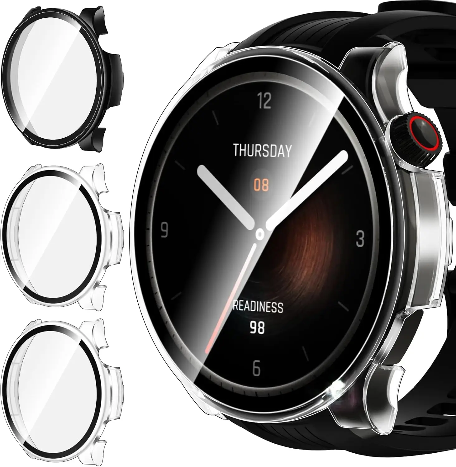 ivoler 3-pack for the Amazfit Balance features a full-protection design with tempered glass screen protectors integrated into hard PC cases (2 transparent + 1 black), providing comprehensive scratch and impact resistance.