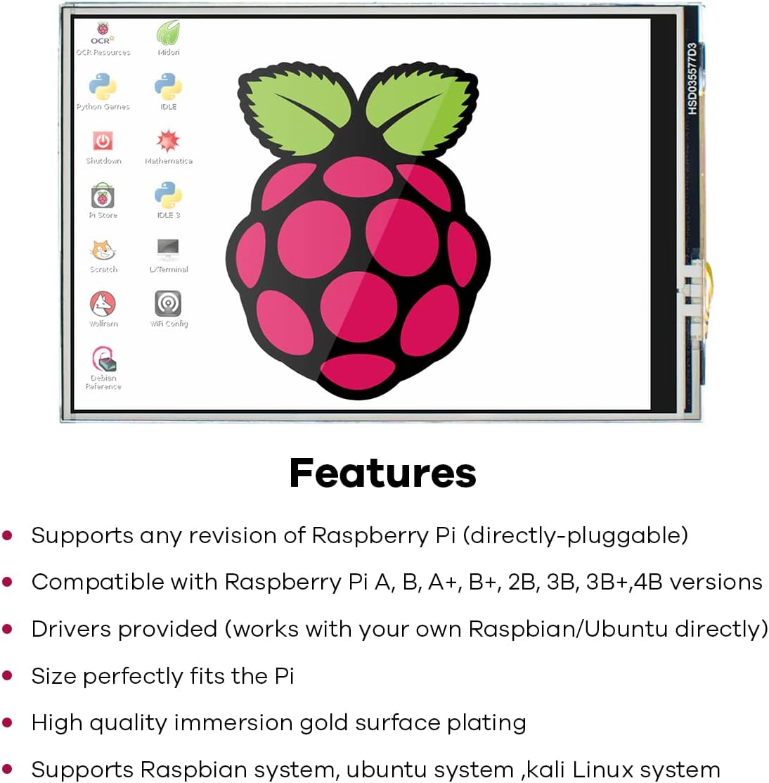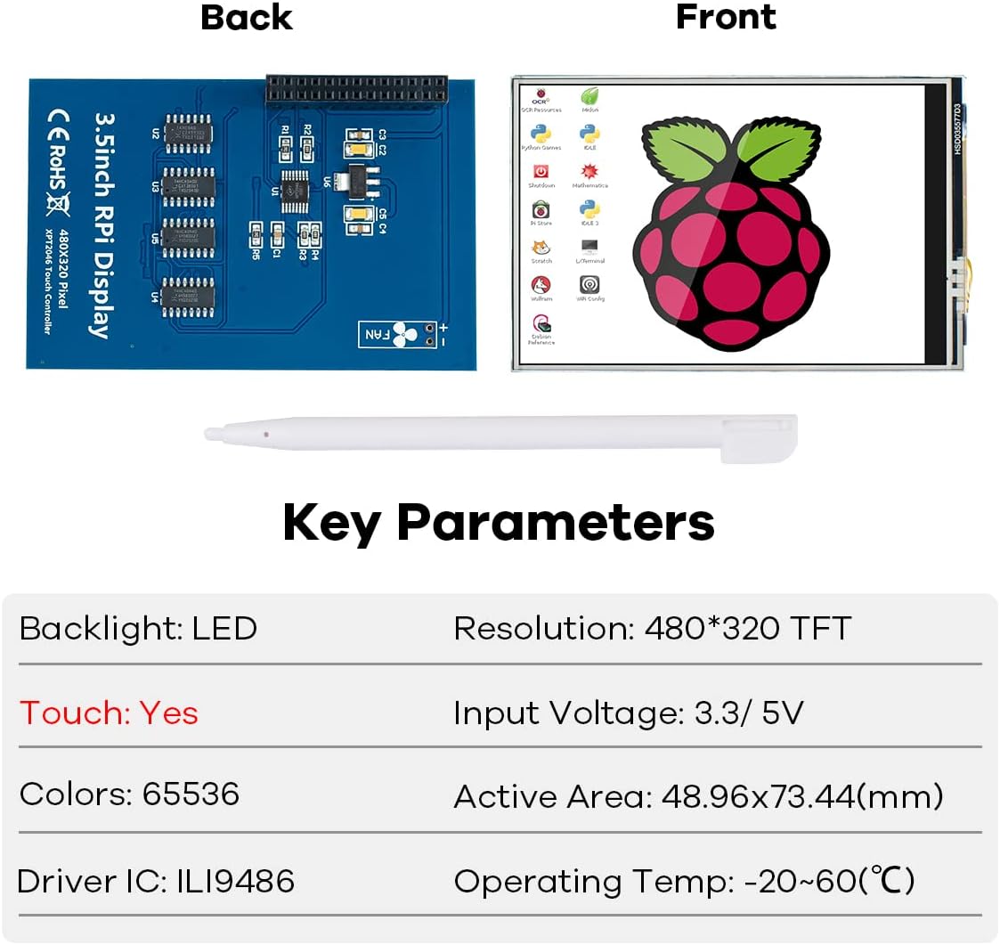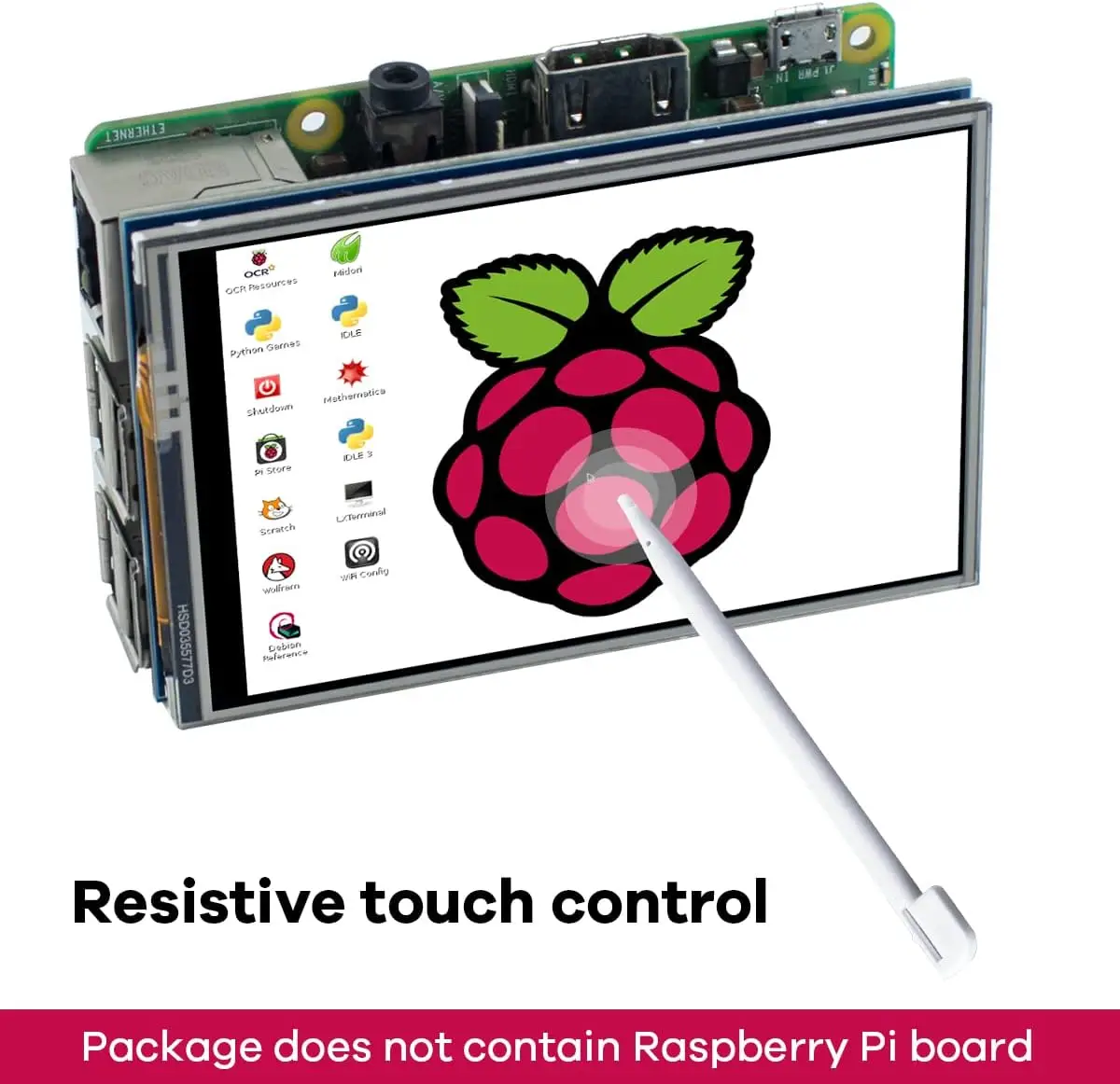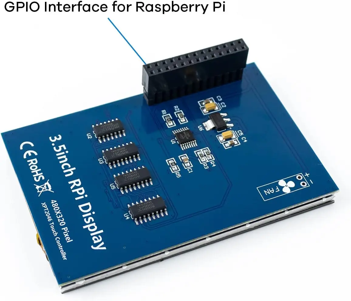 LAFVIN 3.5" TFT Touch Screen (480 x 320) – a compact SPI-interface monitor designed for Raspberry Pi (4B, 3B+, 3B, 2B), featuring direct GPIO mounting and resistive touch support.