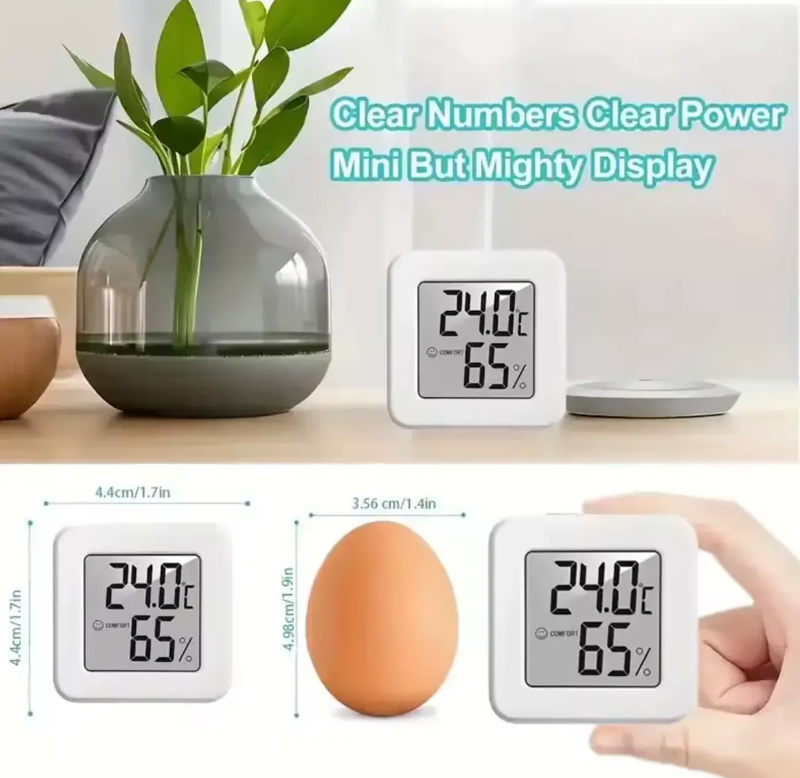 Mini hügro- ja termomeeter. Mõõdud 4.4 x 4.4 sentimeetrit. Komplektis ka kleebis seinale kinnitamiseks.