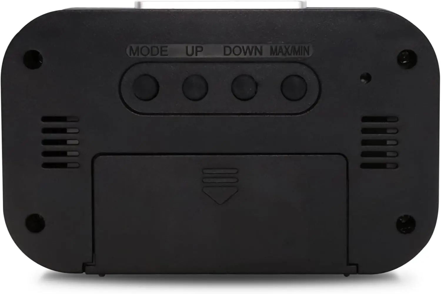 Mooov 477340 digitaalne reisikell – patareitoitega LCD-värvidisplay taustvalgusega, 12/24 h kell, snooze, kalender, meteoriidid, temperatuur ja niiskuse näidud — praktiline multifunktsionaalne lauakell reisiks või koju.