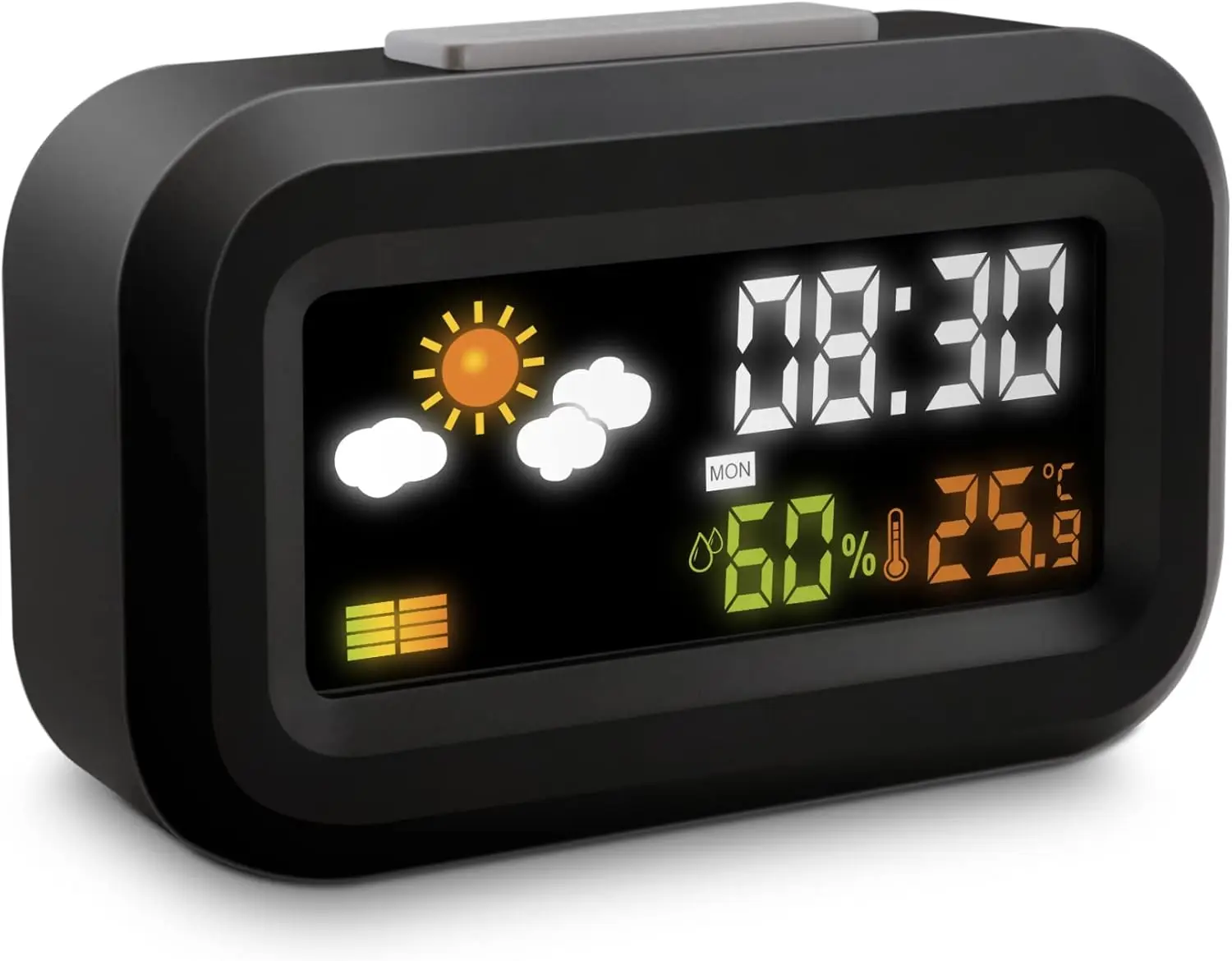 Mooov 477340 digital travel alarm clock – battery-operated with a backlit color LCD display, 12/24 h clock, snooze, calendar, meteorite icons, temperature and humidity readings — a practical multifunctional clock for travel or home.