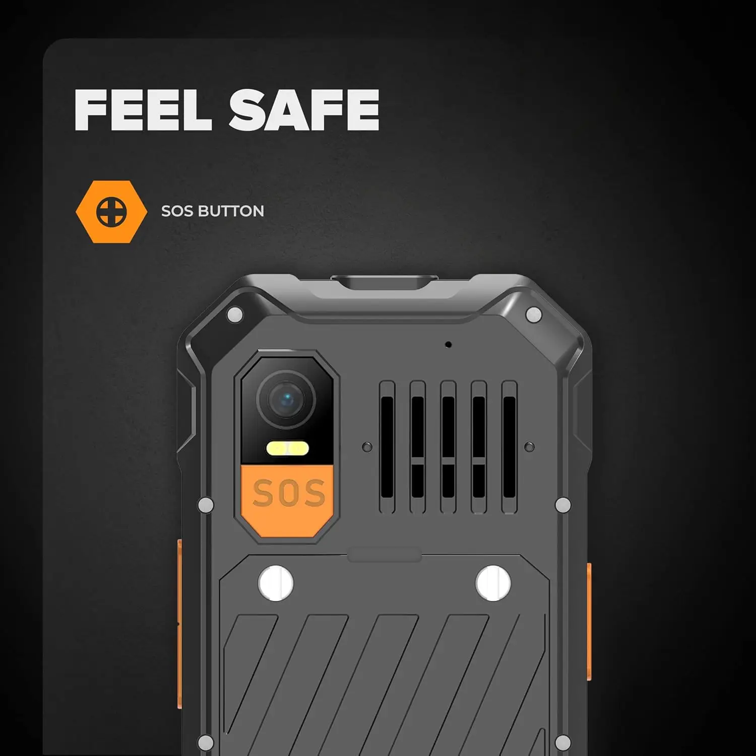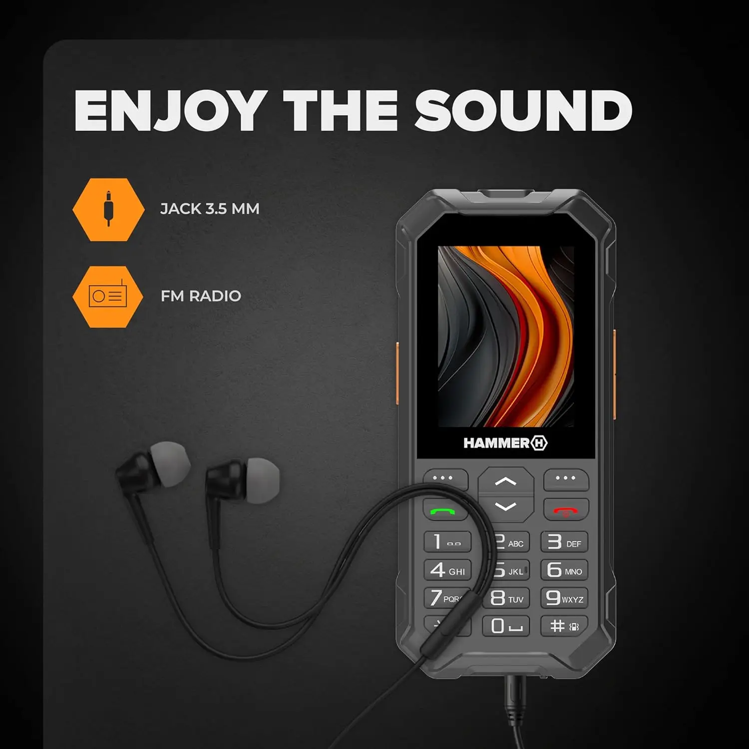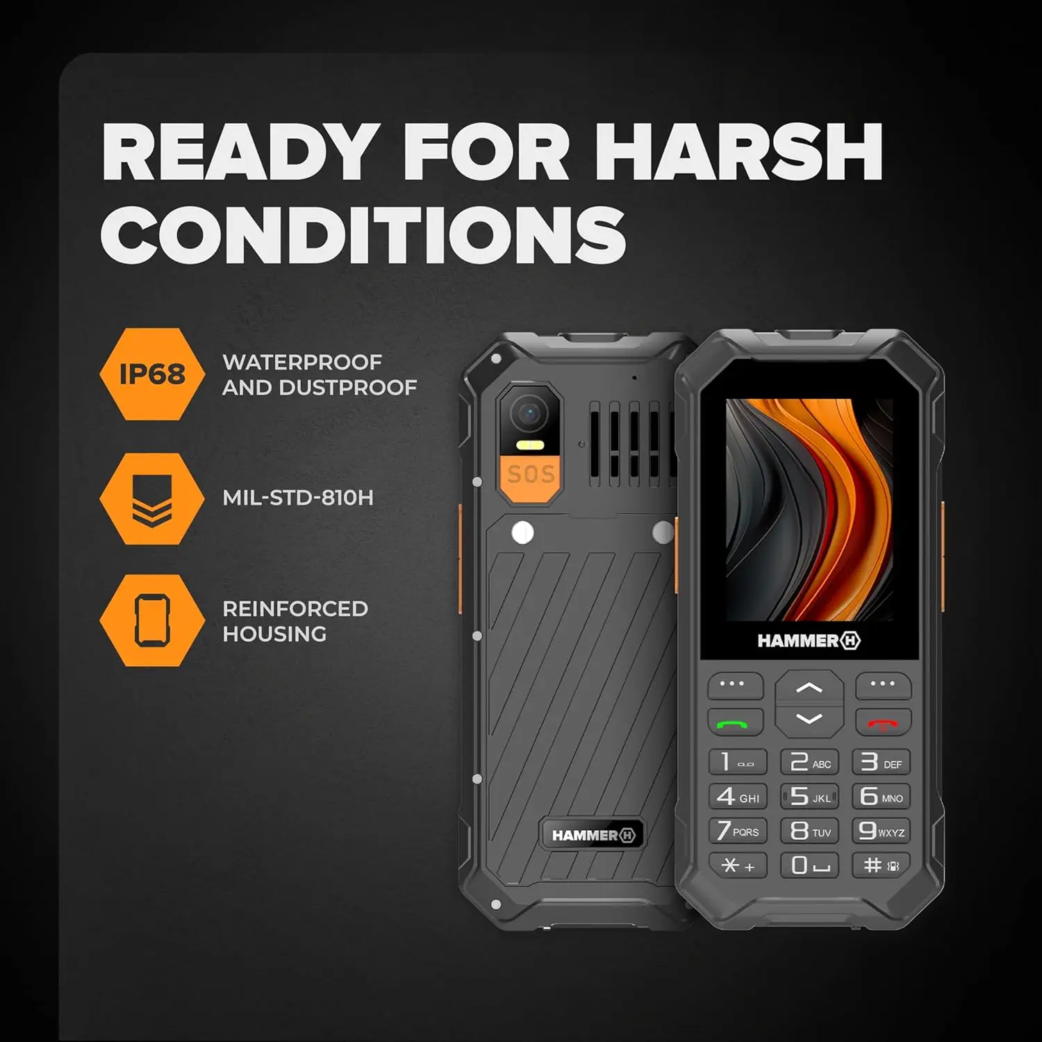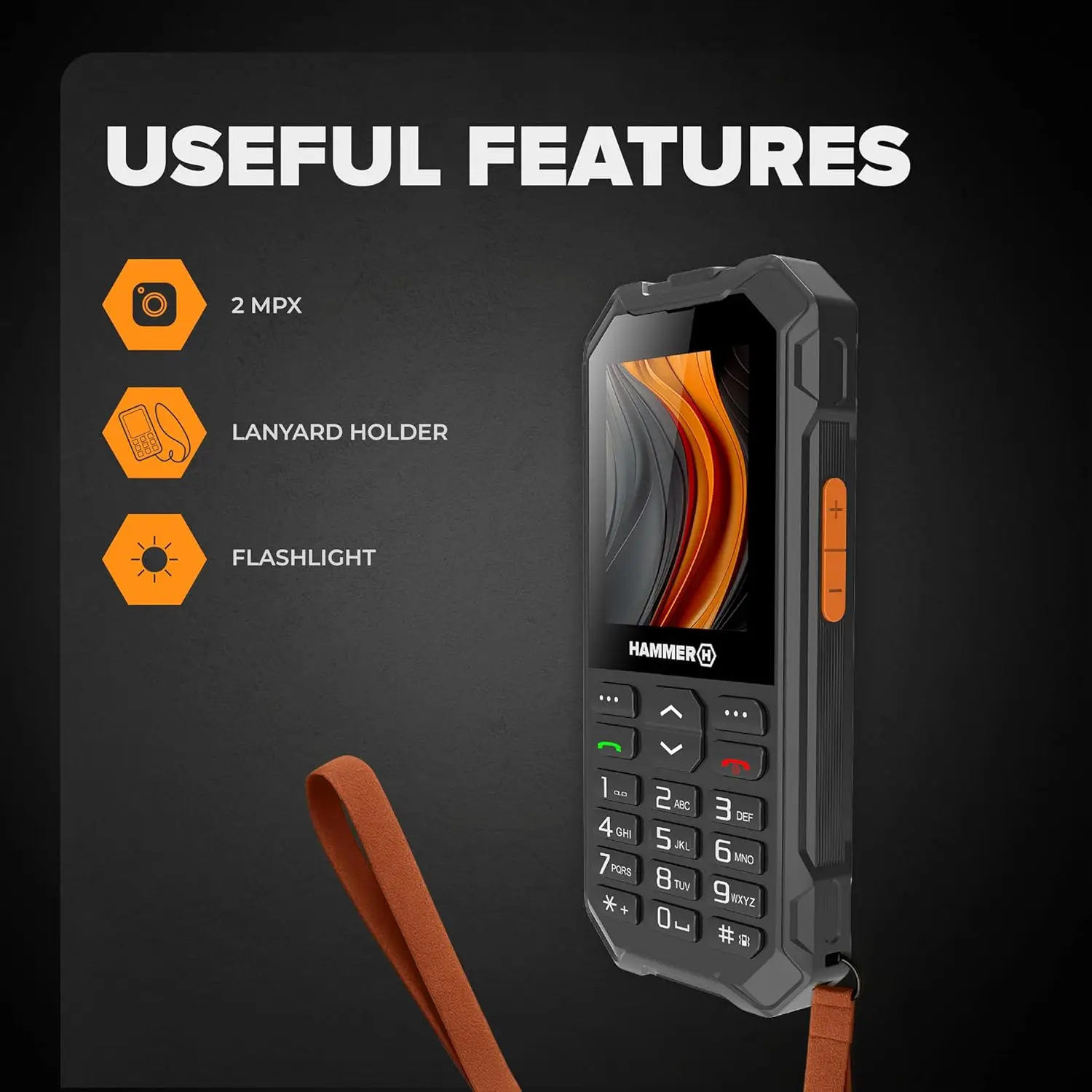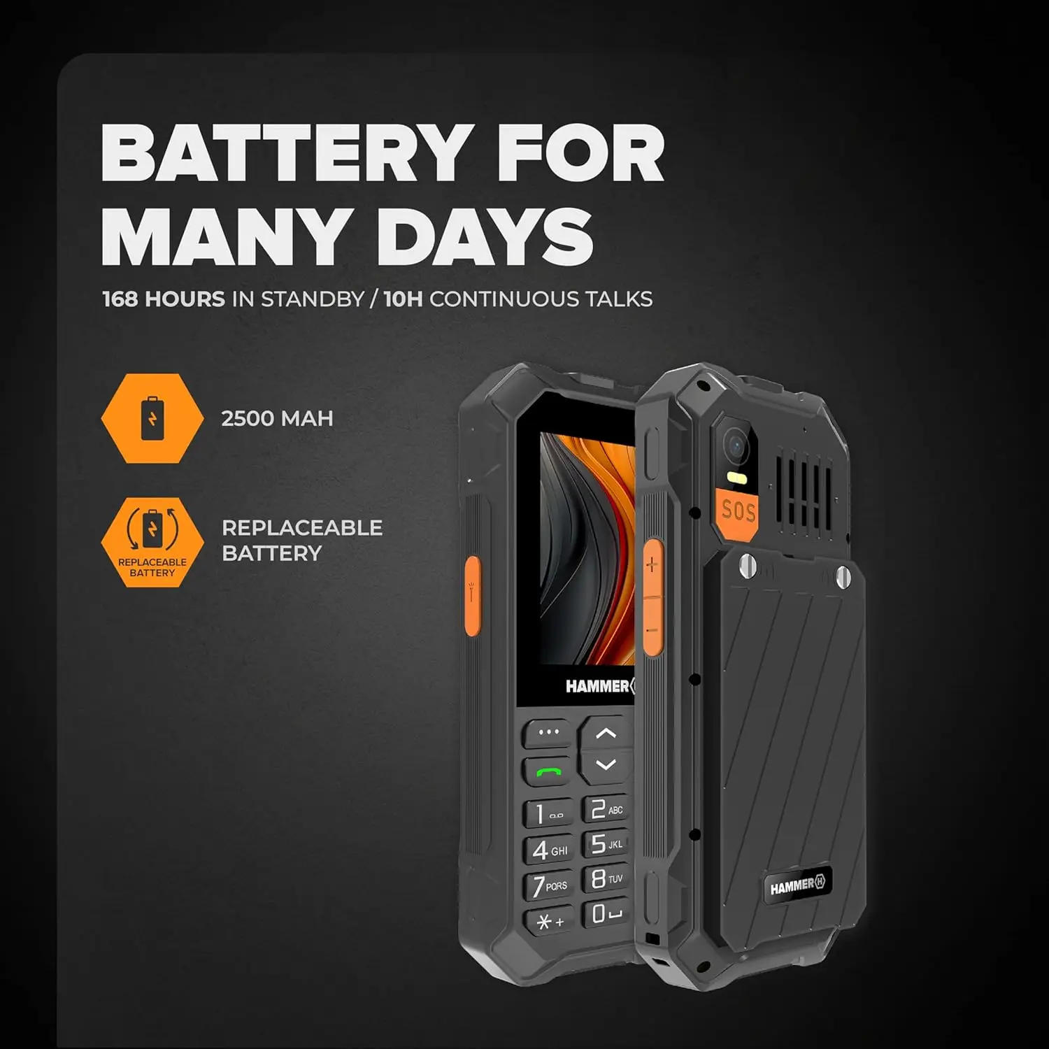 Hammer 6 LTE – a rugged black 4G feature phone featuring a 2500mAh battery, IP68 rating, SOS button, VoLTE technology, and 1.5-meter drop resistance.
