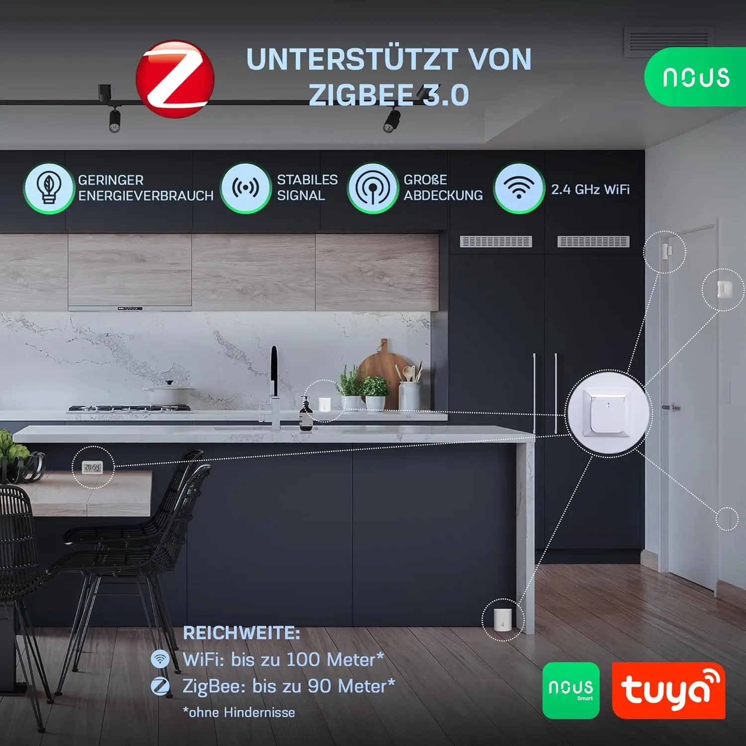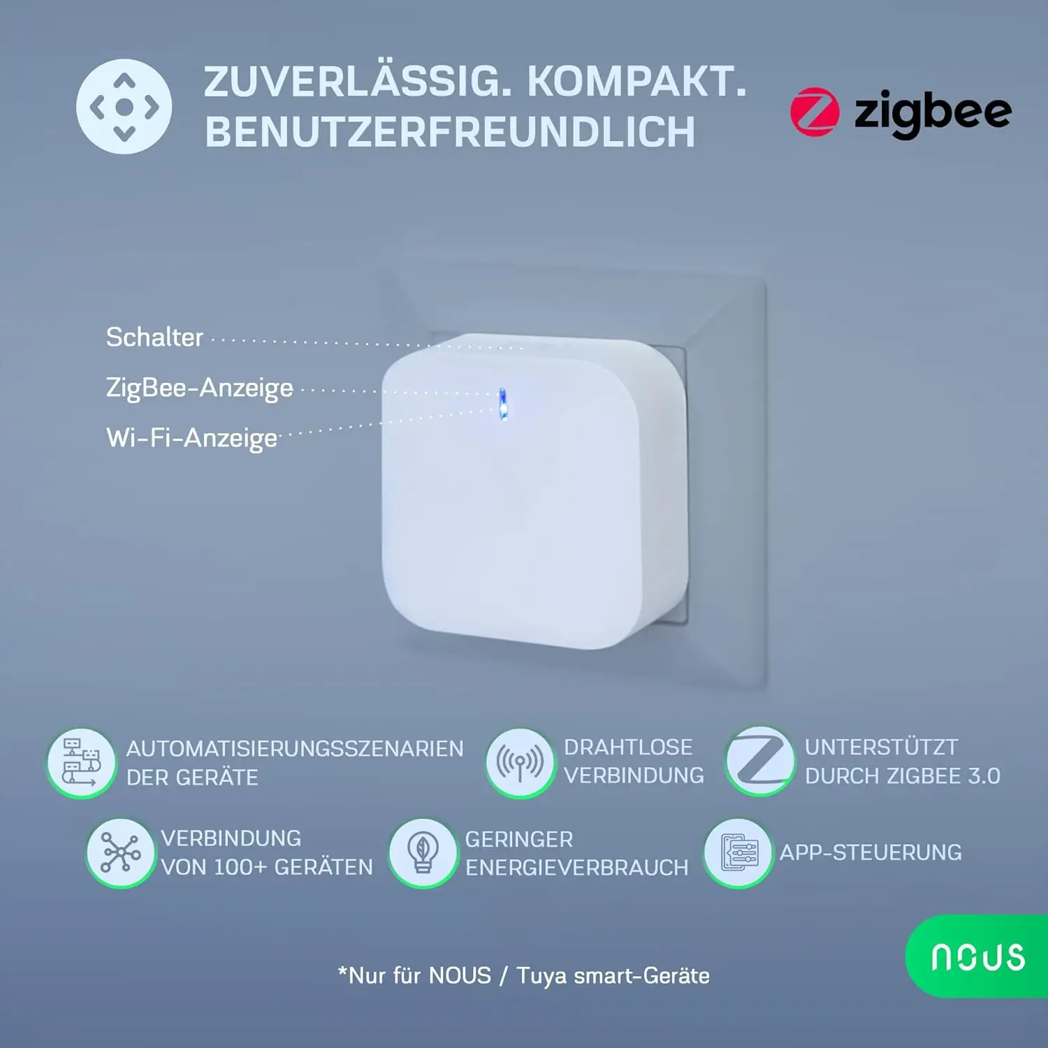 Nous E1 ZigBee Gateway – kompaktne ja universaalne nutikodu keskus, mis toetab ZigBee 3.0 ja Bluetooth protokolle ning võimaldab ühendada kuni 128 seadet Tuya või Smart Life rakenduse kaudu.