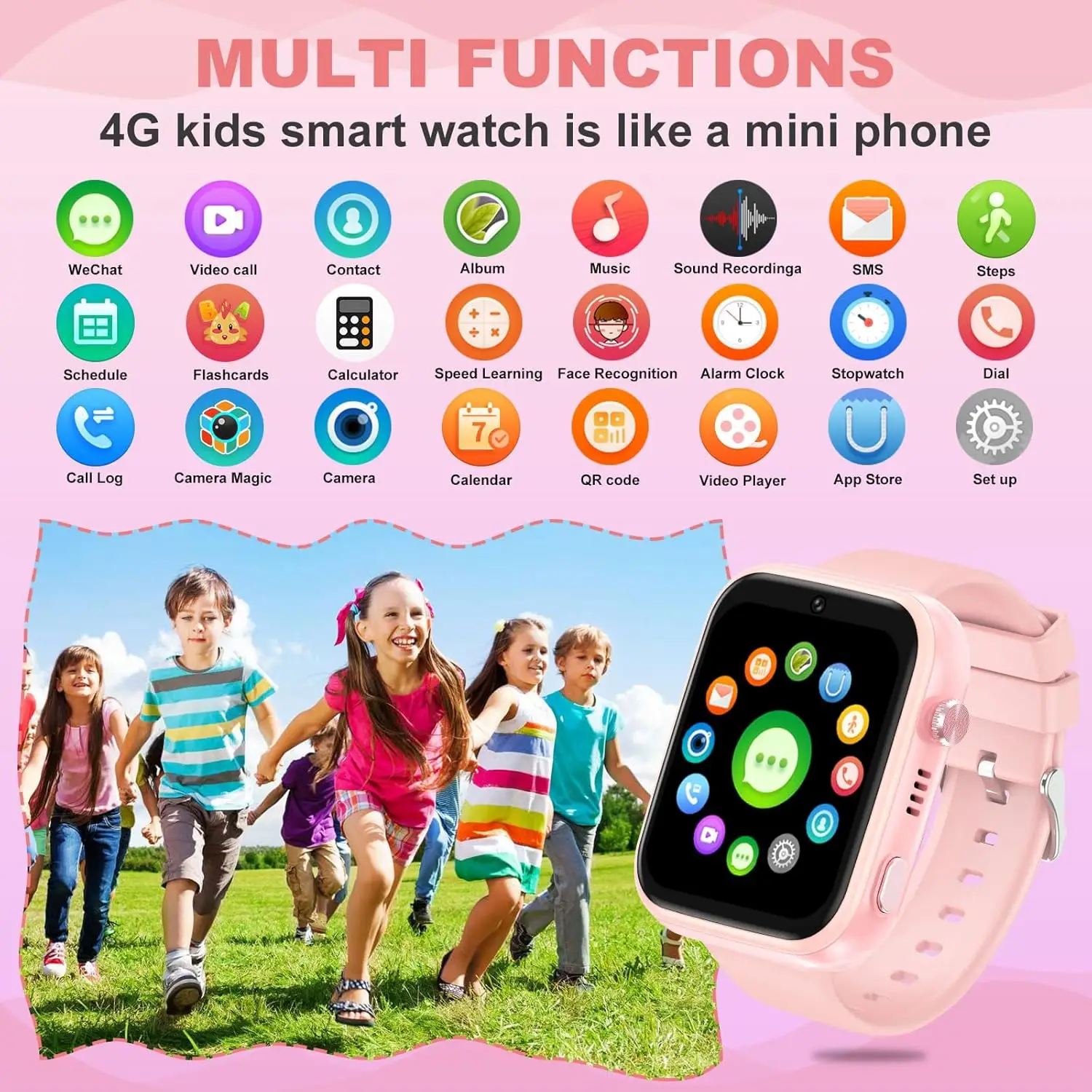 OKYUK 4G Kids Smartwatch (T45 Pink) – pink smartwatch with GPS tracking, two-way calls, SOS button, Wi-Fi and waterproof touchscreen, multiple watch face styles, designed for boys and girls ages 4–12. Only one pink silicone band is included.