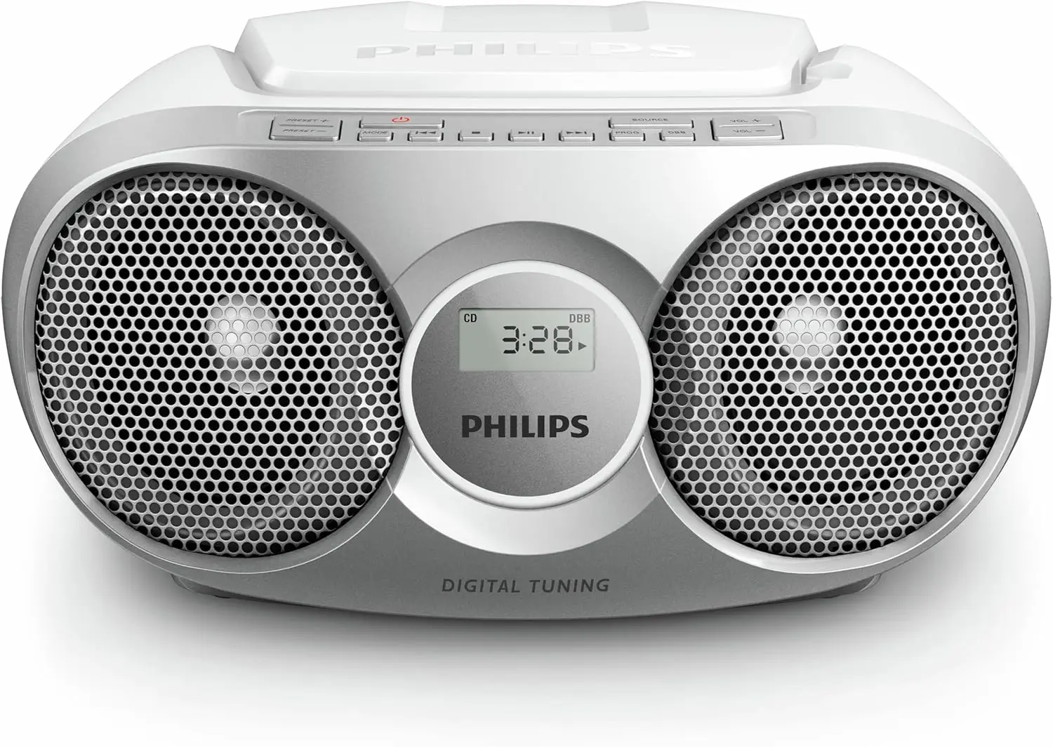 Silver Philips AZ215S/12 radio CD player delivers clear sound and easy operation for both radio listening and CD playback.