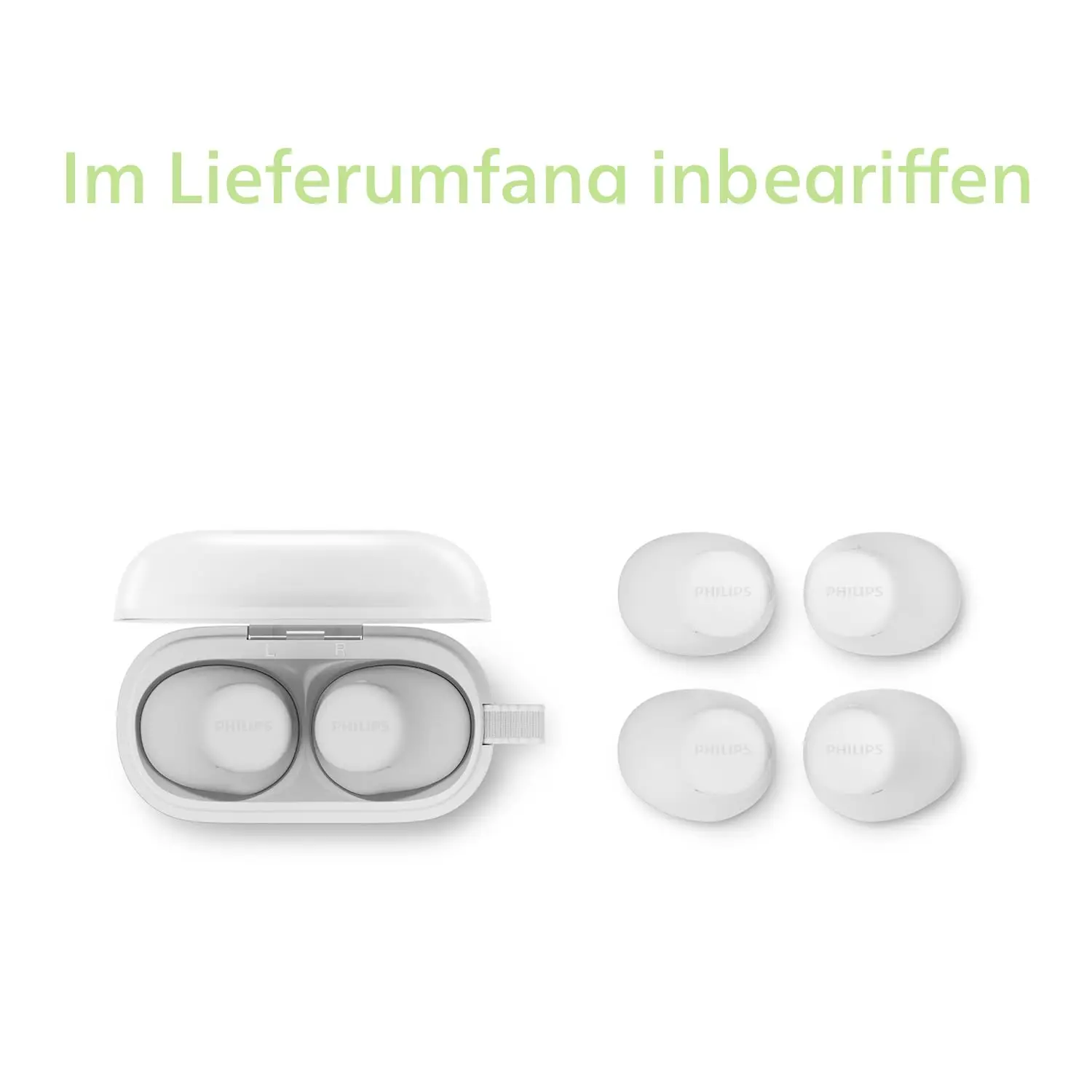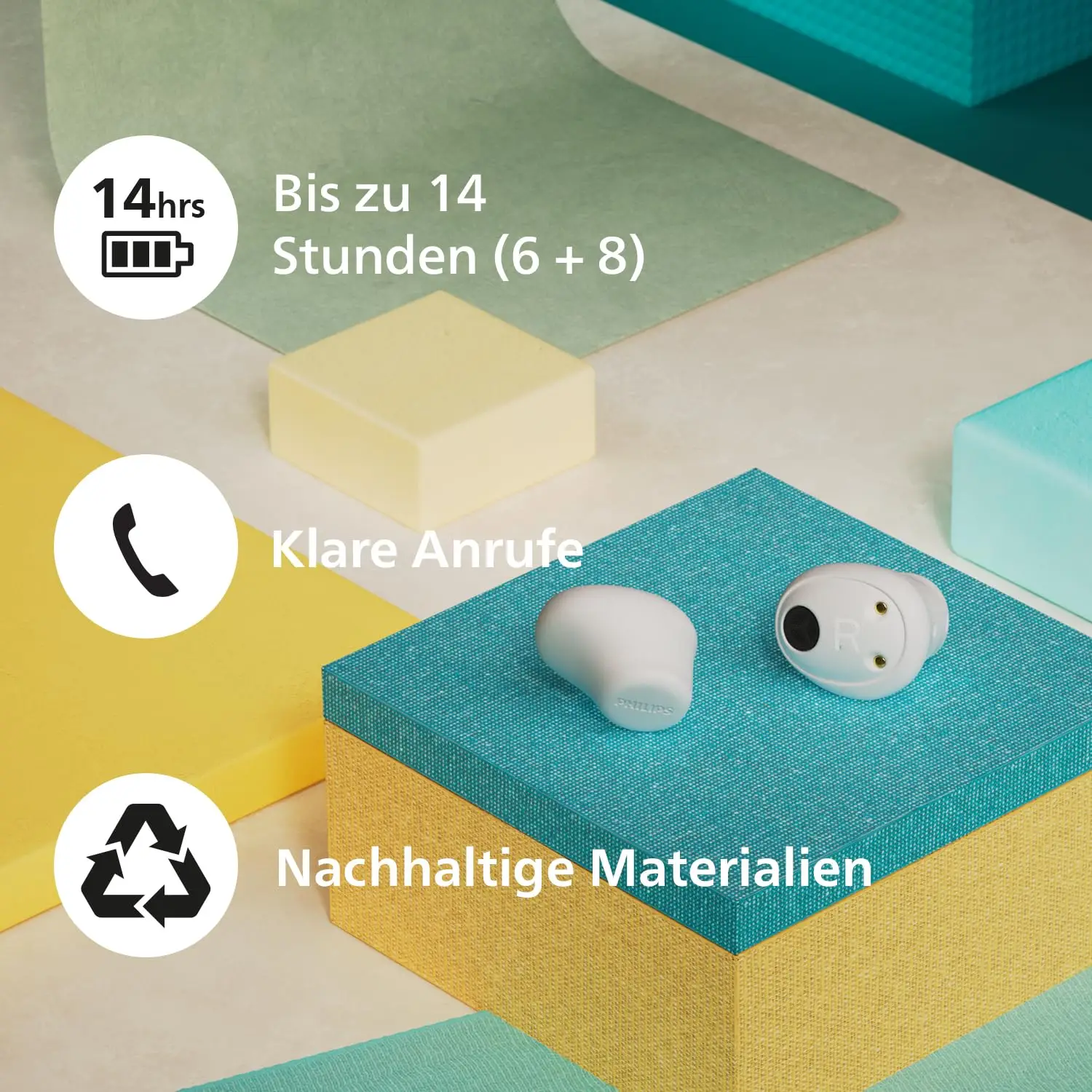 Philips TAT2149WT (White) – compact and splash-resistant (IPX4) true wireless earbuds featuring up to 15 hours of battery life with the charging case and a comfortable, secure fit.