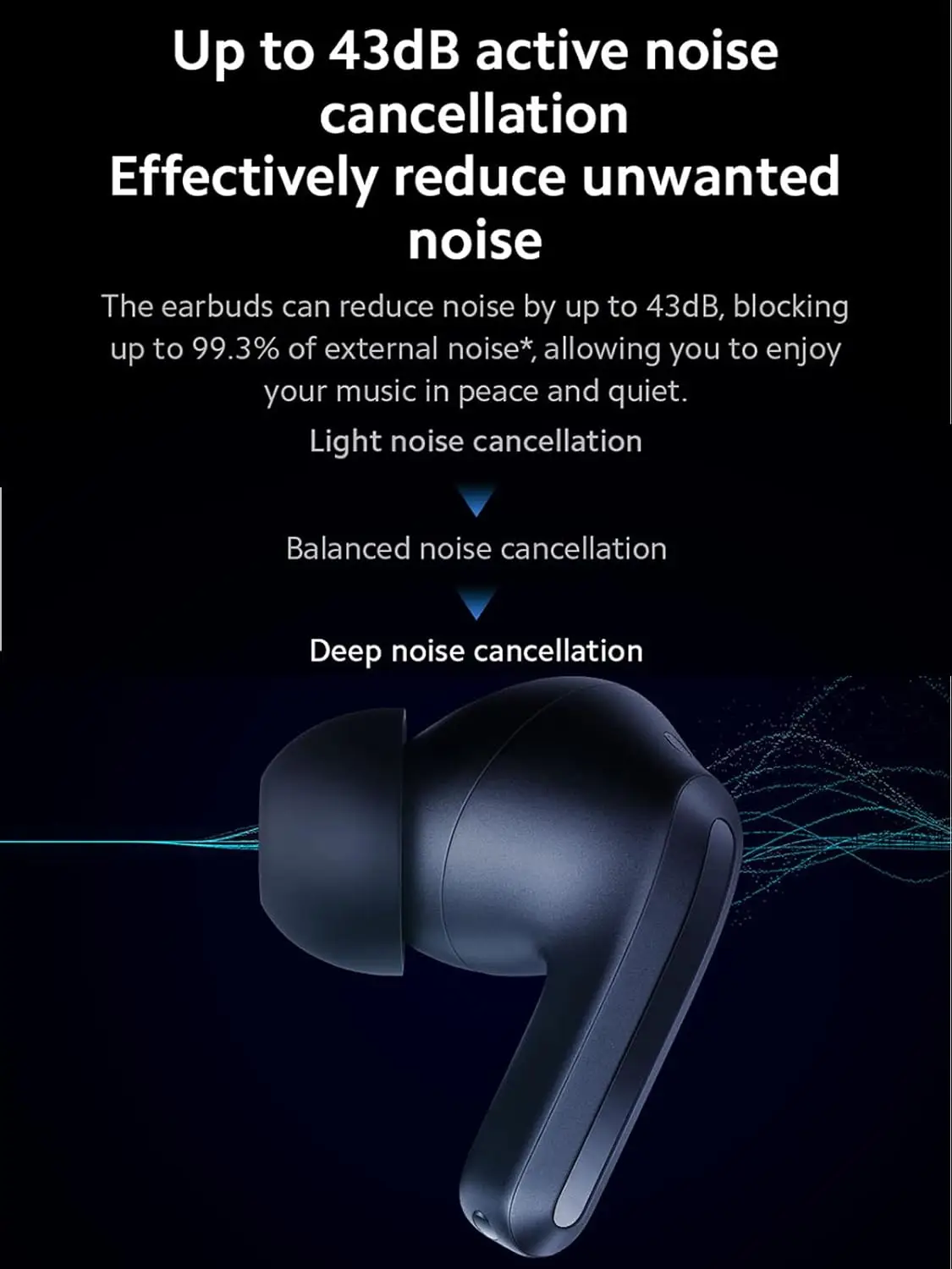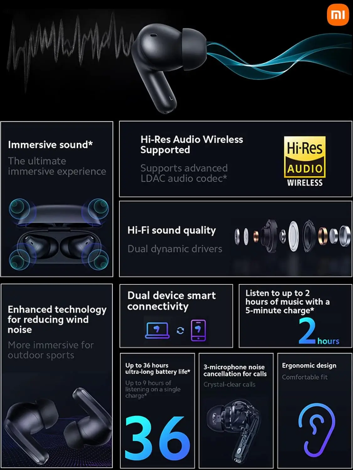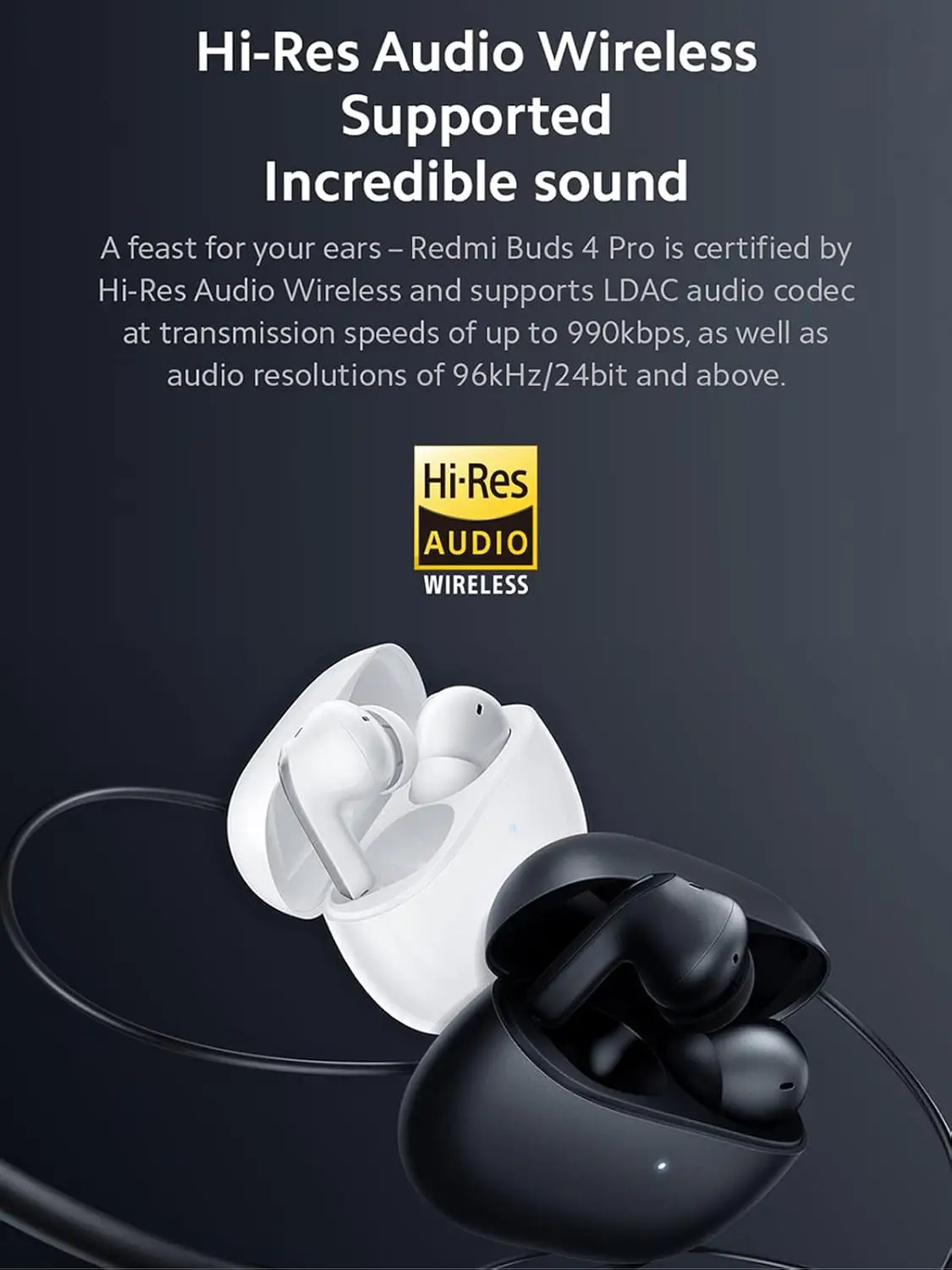 Xiaomi Redmi Buds 4 Pro (White) – flagship True Wireless earbuds featuring Hi-Res Audio Wireless certification, up to 43dB active noise cancellation (ANC), and up to 36 hours of total battery life.