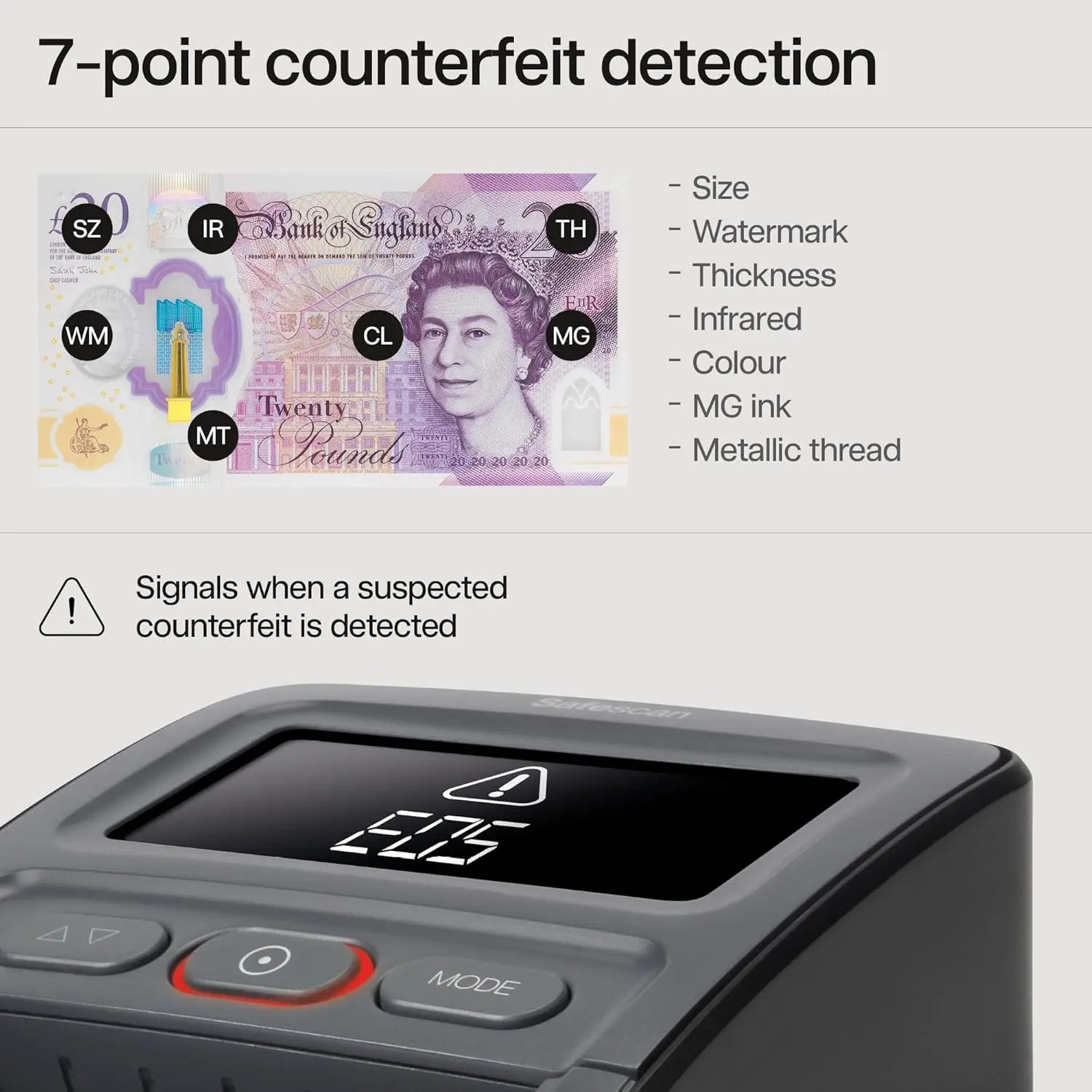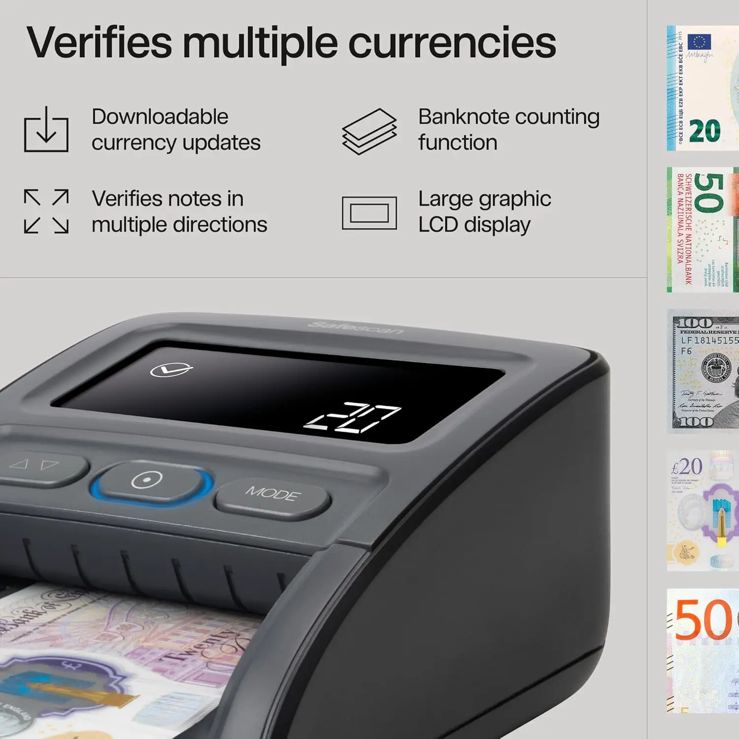Safescan 155-S Automaatne pangatähe tester kiireks rahatähtede kontrollimiseks – valeraha tester 7-viisilise autentimise kontrolliga – 100% täpne tester koos rahatähtede hoidjaga.