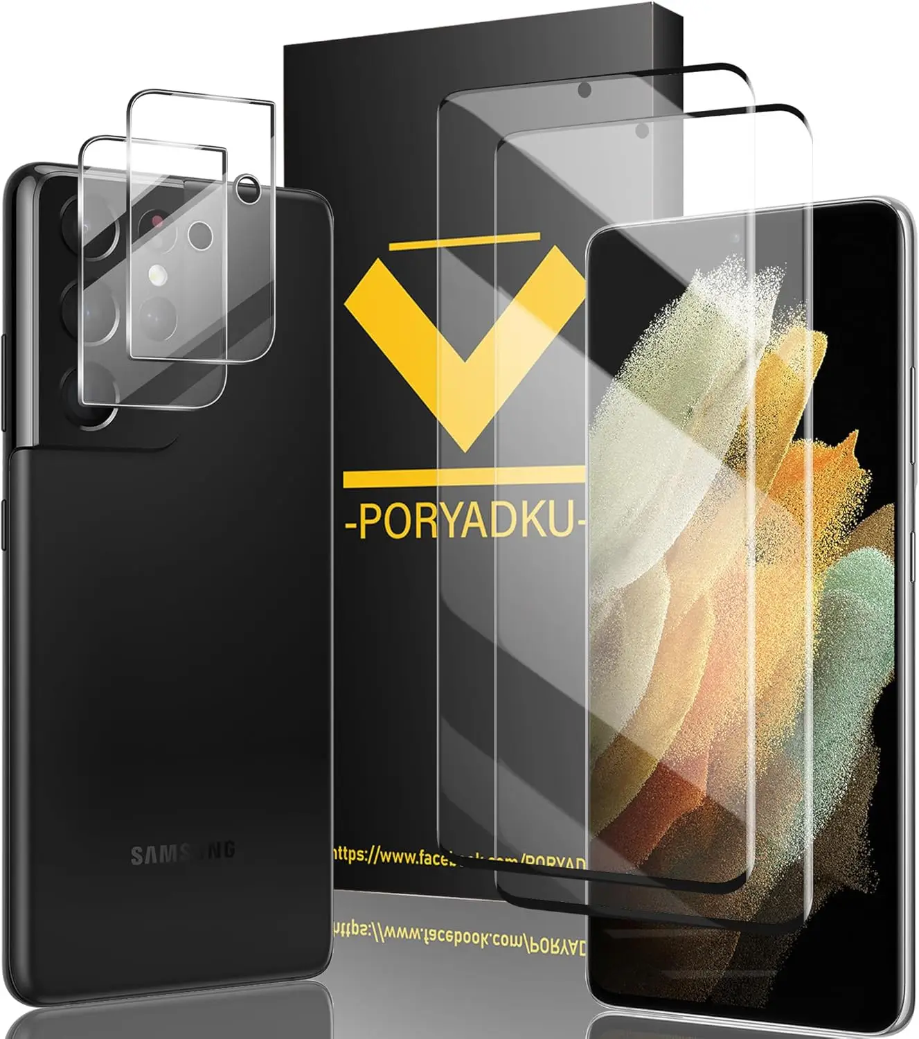Samsung Galaxy S21 Ultra 2+2 pack features two 9H hardness tempered glass screen protectors and two camera lens protectors, specifically designed to be compatible with the ultrasonic fingerprint sensor.