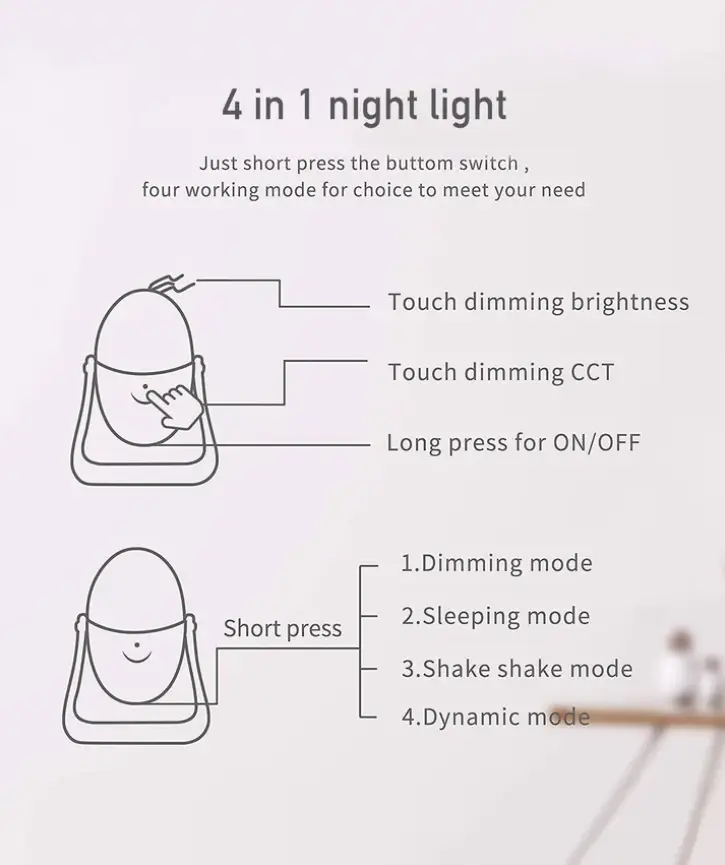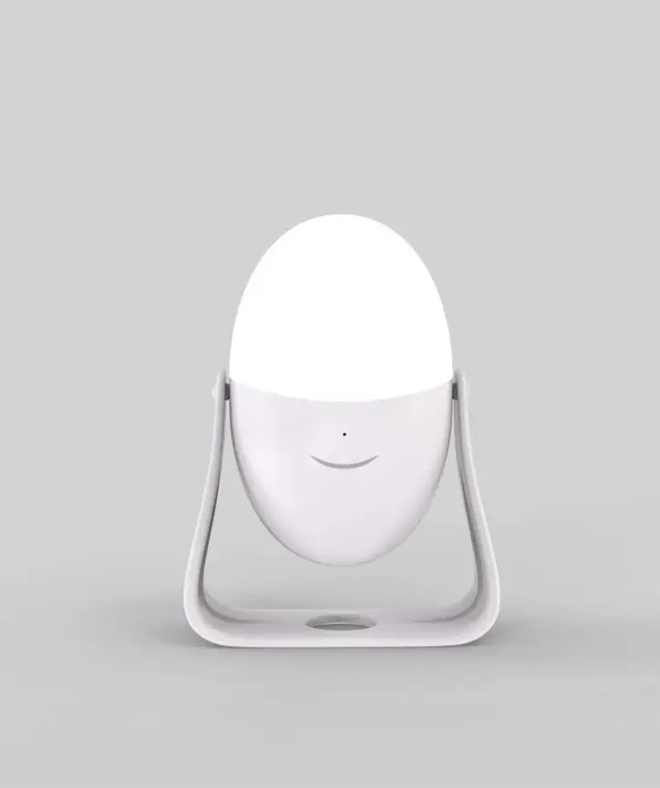 Shake-shake Egg Night Light – LED night light with RGB and shake-to-change color modes, adjustable brightness and dimmable warm white light, detachable design for use as a light toy, powered via Micro-USB cable with included stand.