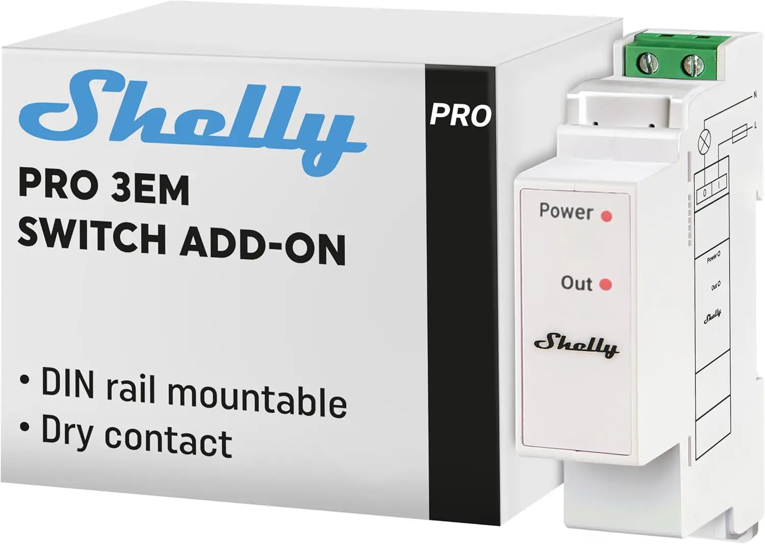 The Shelly Pro 3EM Switch Add-On is a DIN-rail mountable accessory that adds a 2A potential-free contact (dry contact) to the Pro 3EM energy meter, enabling contactor control and load switching via the app without requiring a hub.