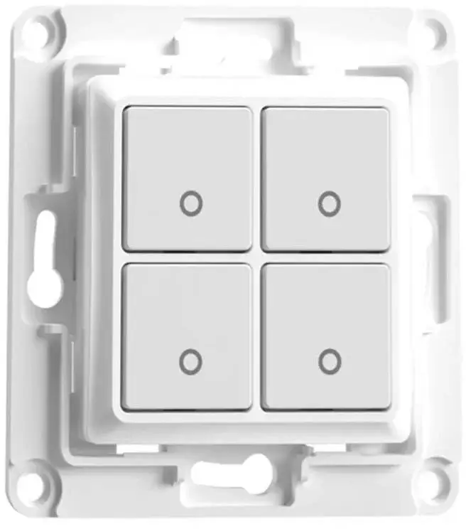 Shelly Wall Switch 4 (8x8cm) – a white four-button smart wall switch designed specifically for Shelly Plus series relays, fitting into standard flush-mount wall boxes.