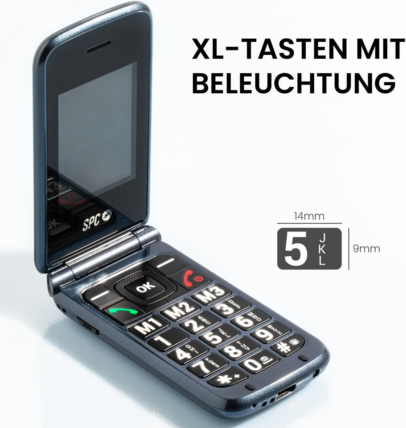 4G flip phone for seniors features large buttons, 103dB volume, an SOS button, and three direct memory keys, complete with a dedicated charging base.