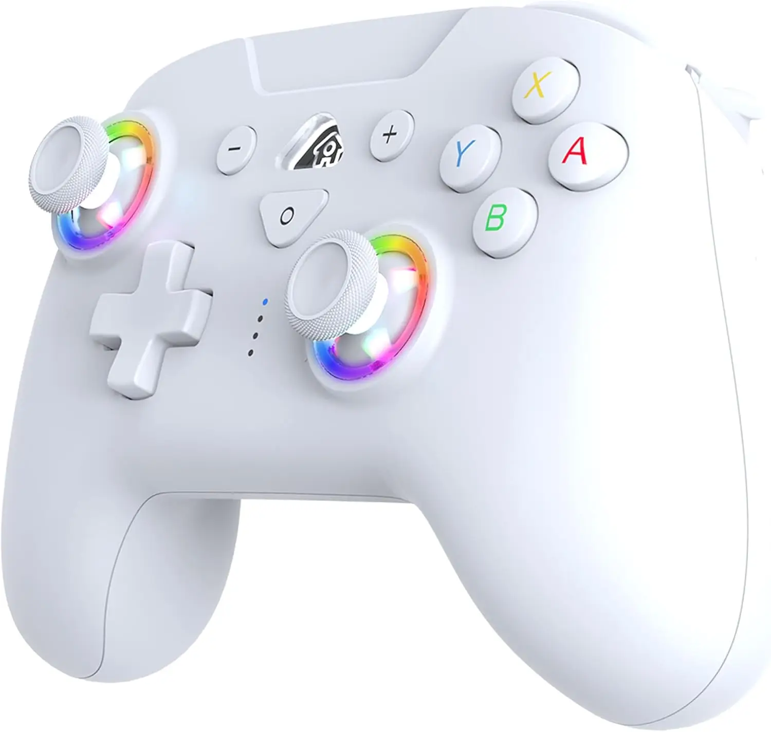 See valge Subsonic juhtmevaba Bluetooth-mängupult ühildub Switch ja Switch 2 konsoolidega ning on varustatud LED-valgustuse, vibratsioonimootorite ja 6-teljelise güroskoobiga.