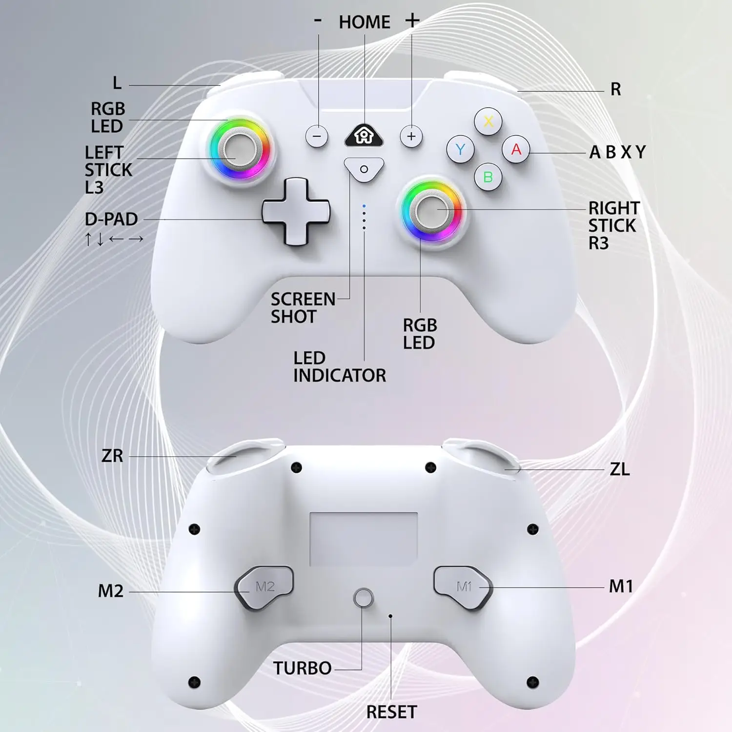 This white Subsonic wireless Bluetooth controller is compatible with Switch and Switch 2, featuring integrated LED lighting, vibration feedback, and a 6-axis gyroscope.