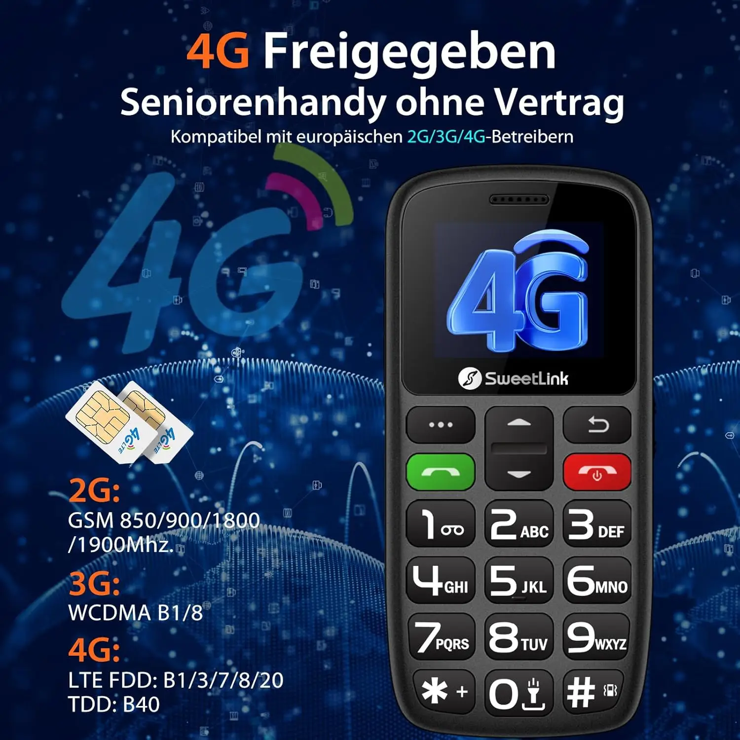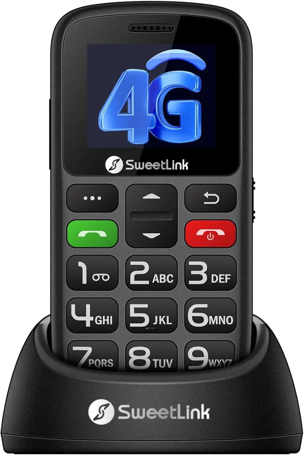 SweetLink S2-4G Senior Mobile Phone – a 4G handset featuring an SOS button, 1400mAh battery, charging cradle, 1.77-inch color display, and Dual SIM (Nano-SIM only).