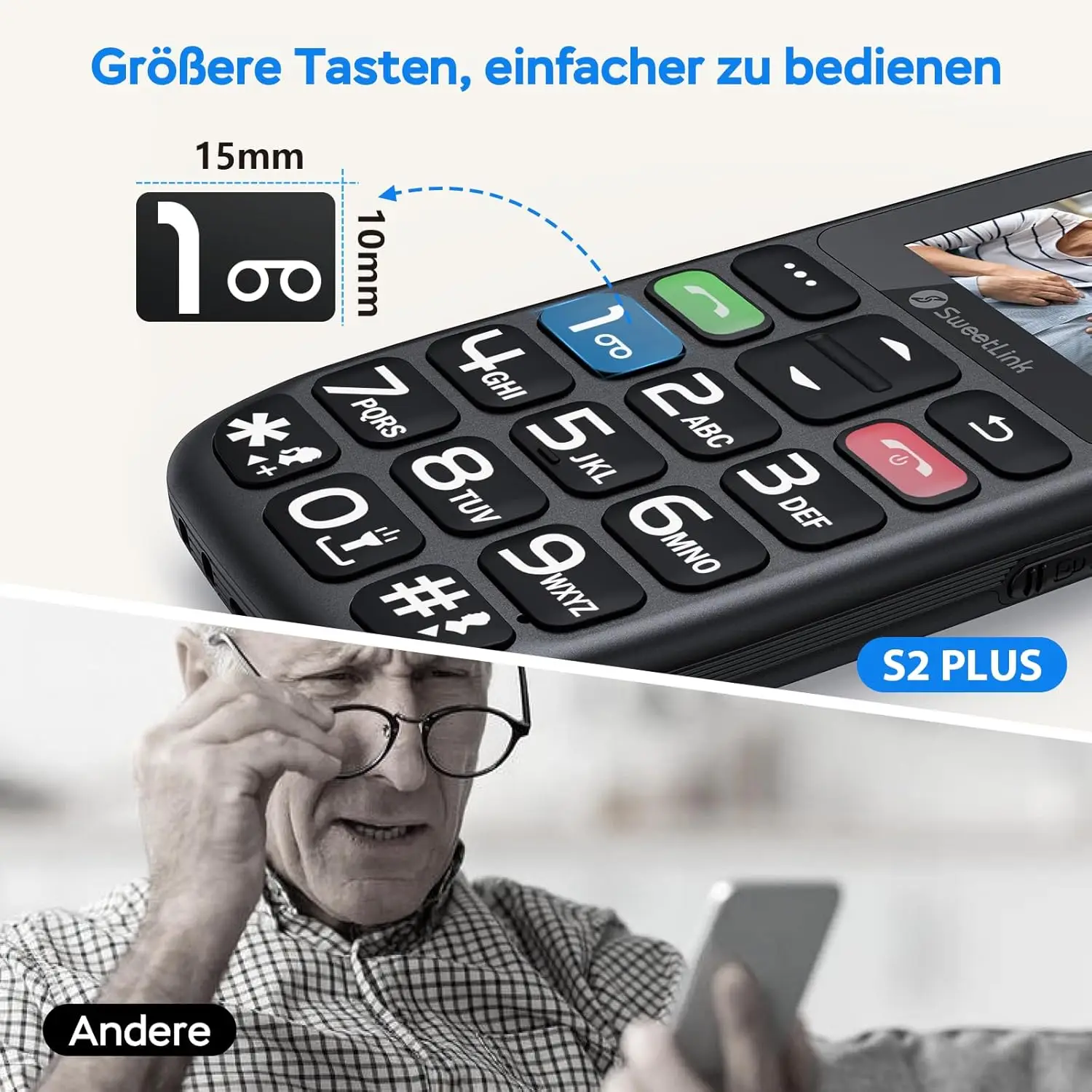 SweetLink S2-4G – eakatele mõeldud 4G mobiiltelefon, millel on SOS-nupp, 1400 mAh aku, laadimisdokk, selge värviline ekraan ja Dual SIM tugi (ainult Nano-SIM).