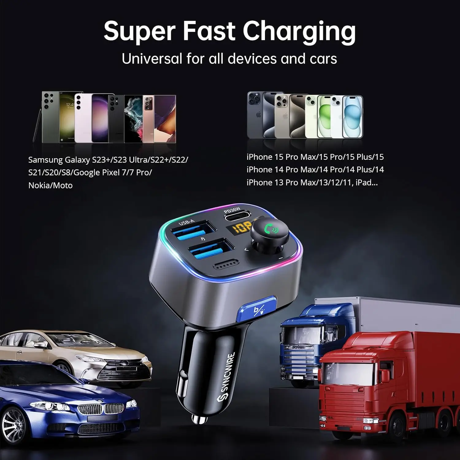 Syncwire Bluetooth 5.3 FM Transmitter and 48W Car Charger – a black dual-port adapter (36W PD & 12W) featuring a wireless radio LED display, 64GB USB drive support, and a light switch.