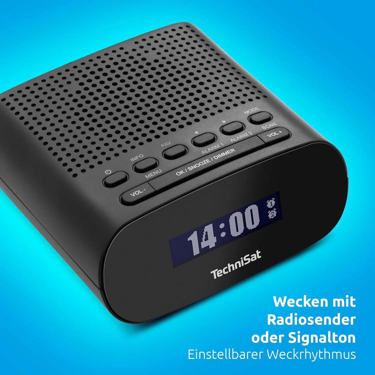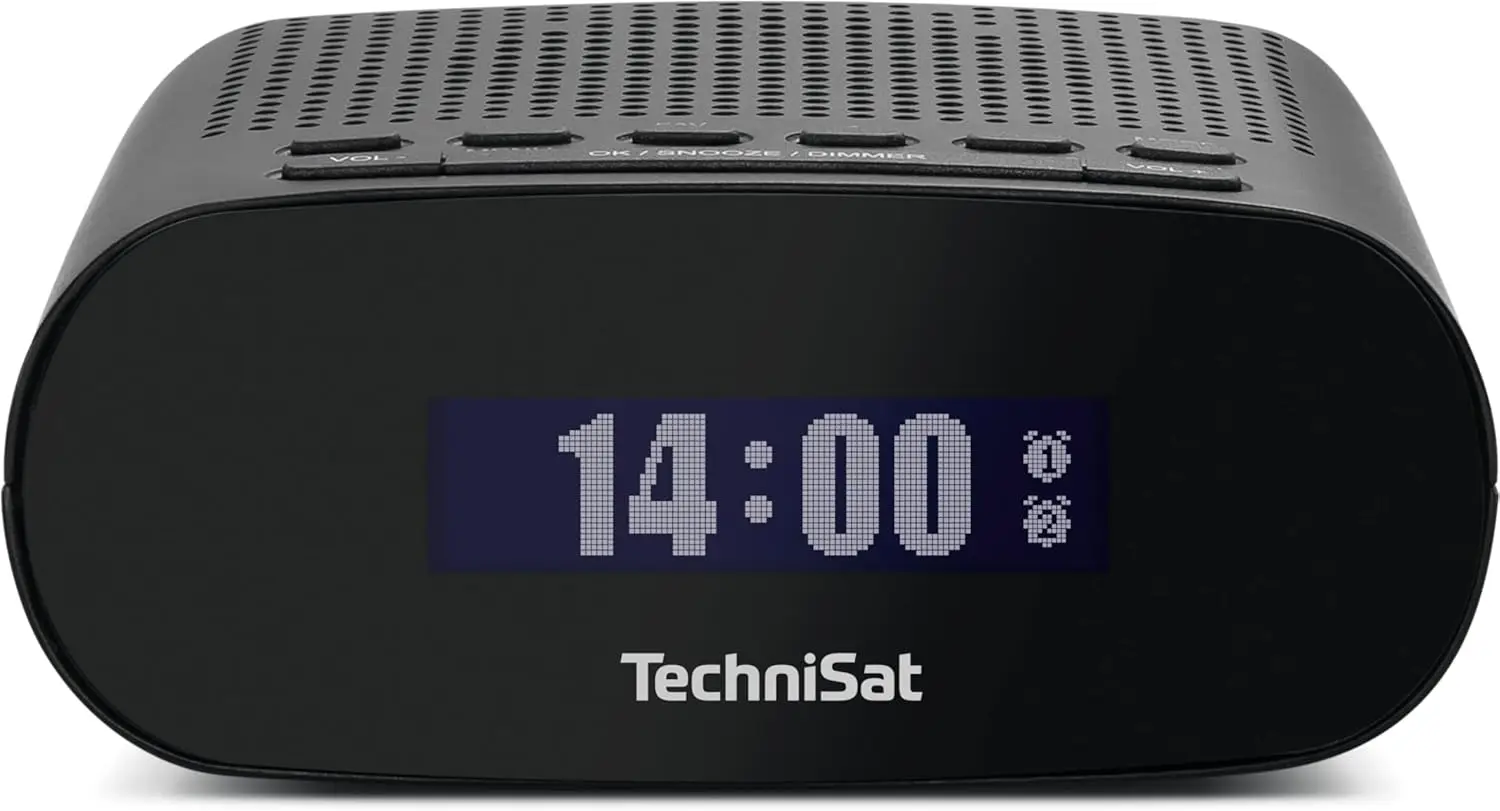 TechniSat TECHNIRADIO 50 (Black) – a compact DAB+ and FM clock radio featuring a large LCD display, dual-alarm functionality, headphone jack, and USB power supply.