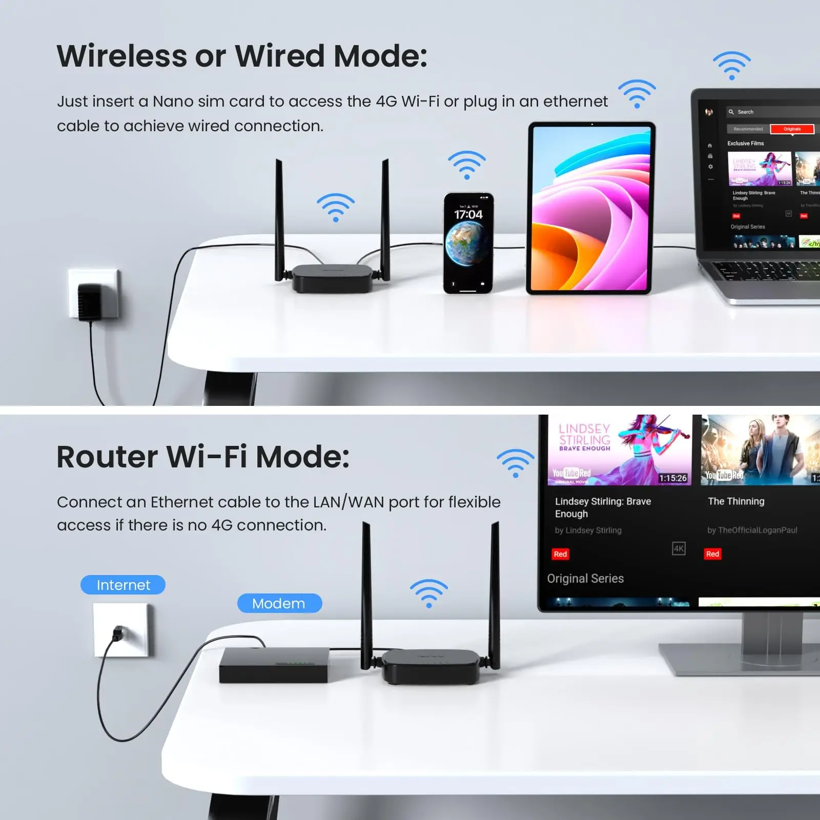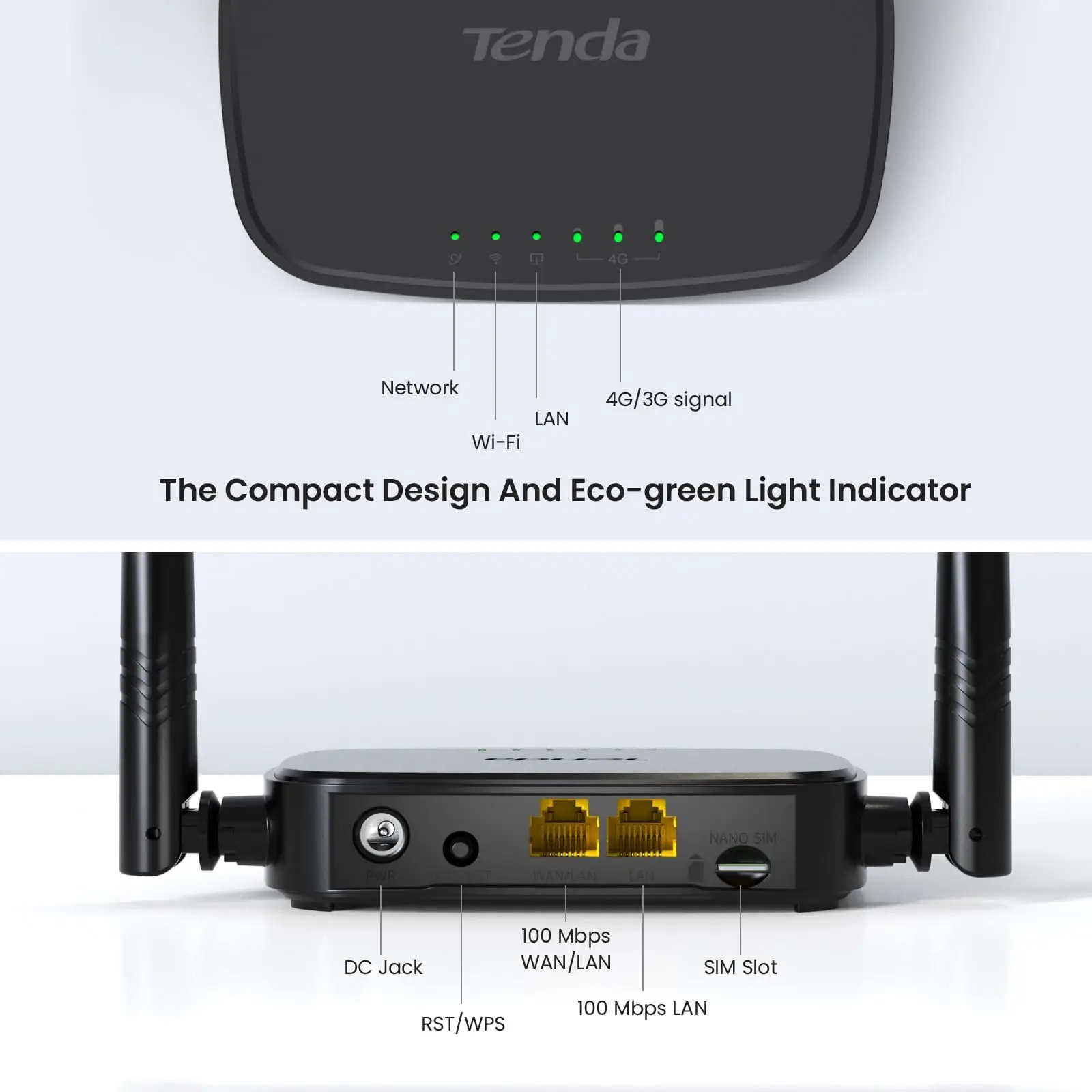 Tenda 4G03 Pro – a compact 4G LTE router supporting download speeds up to 150 Mbps, allowing internet sharing for up to 32 devices with two integrated Ethernet ports for wired connectivity.
