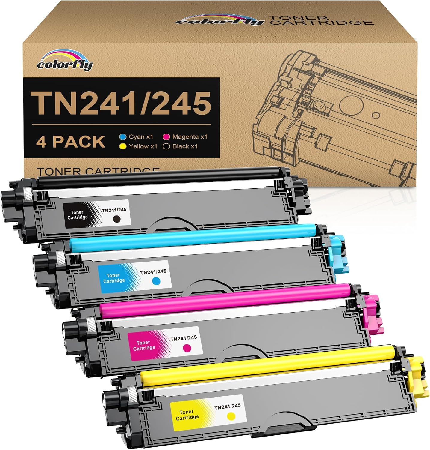 Colorfly TN241/TN245 toner compatible 4-pack (black, cyan, magenta, yellow) for Brother TN242/TN246/TN-241/TN-245 series printers including MFC-9332CDW, DCP-9022CDW, HL-3142CW, MFC-9142CDN, HL-3152CDW, HL-3140CW, MFC-9330CDW, MFC-9140CDN and DCP-9020CDW, delivering clear and quality prints.