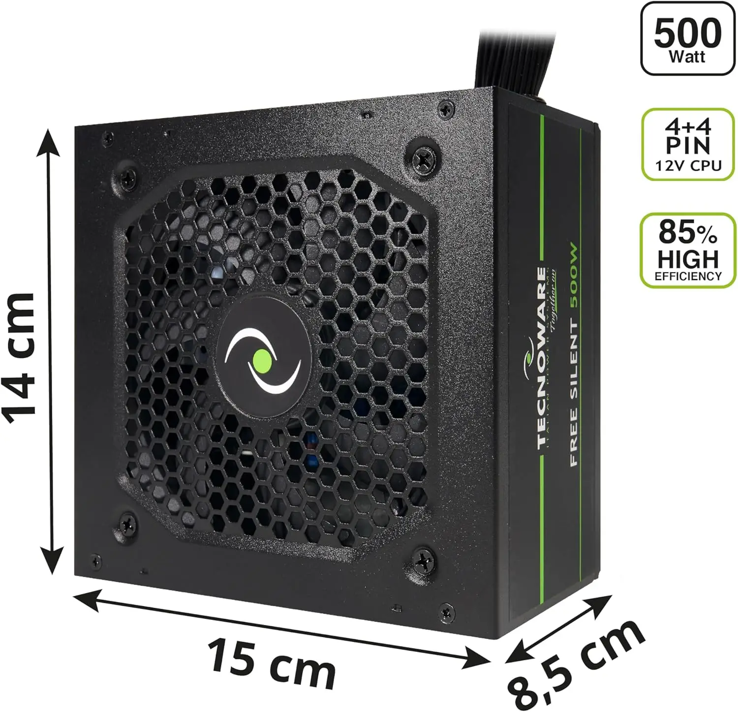 Tecnoware Power Systems ATX 500 – black 500 W ATX power supply with ultrasilent 12 cm fan, surge protection, 2× SATA, 2× Molex, 1× 24-pin and 1× 12V 4+4-pin connectors, compatible with ATX 12V v2.01 standard.